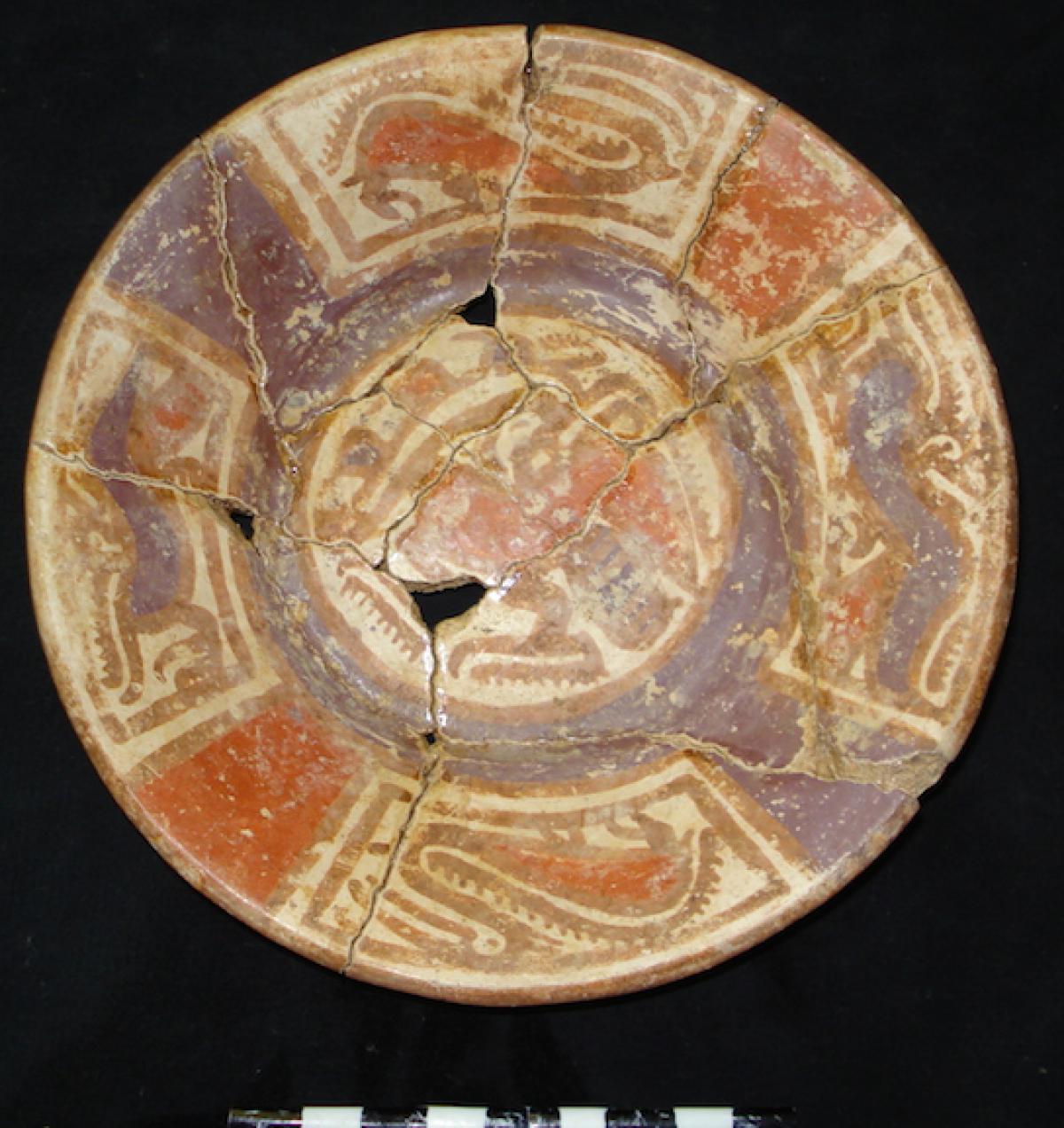 385 - Plato polícromo de borde engrosado exterior. Doble engobe (blanco en el anverso y rojo en el reverso) y decoración en bandas de color alternas zigzagueantes (rojo y morado).
