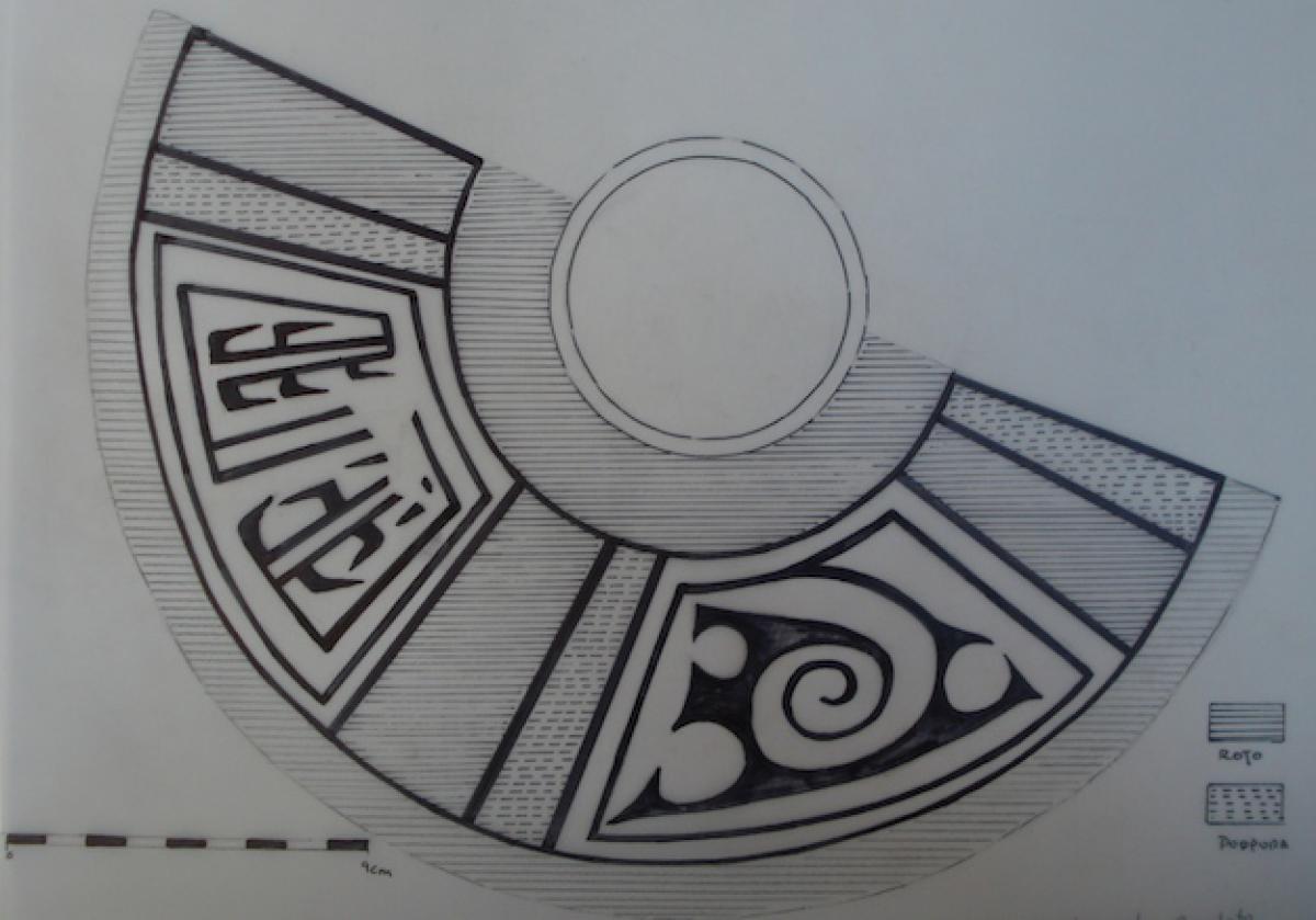 385 - Plato polícromo de borde engrosado exterior. Doble engobe (blanco en el anverso y rojo en el reverso) y decoración en bandas de color alternas zigzagueantes (rojo y morado).