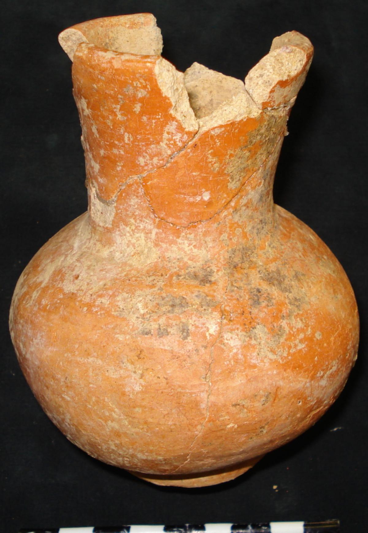 3565 - Jarra globular con base anular, cuello largo y borde recto. Engobe de color rojo en el exterior y engobe de color blanco sobre el cuello. Banda de color morado sobre el cuello.