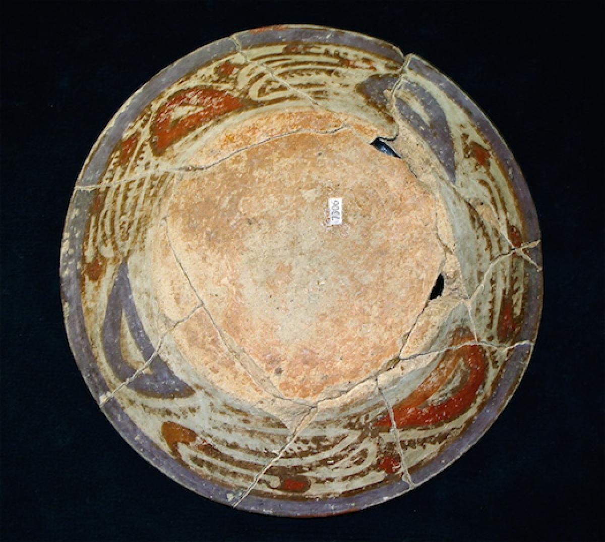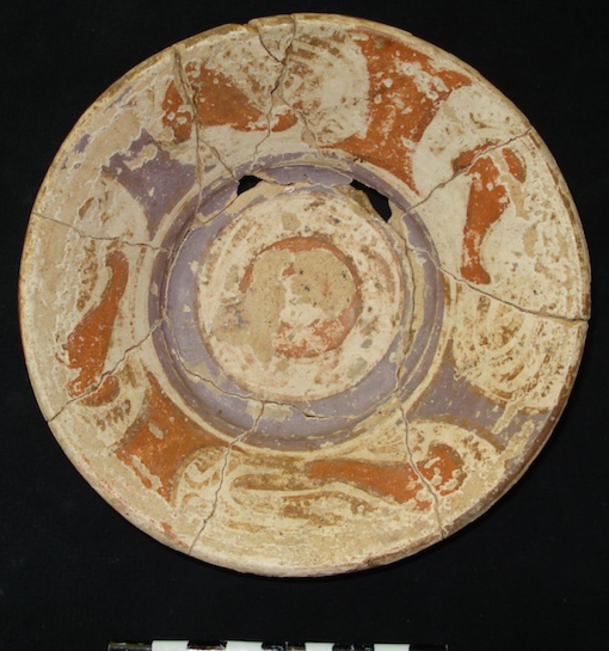 385 - Plato polícromo de borde engrosado exterior. Doble engobe (blanco en el anverso y rojo en el reverso) y decoración en bandas de color alternas zigzagueantes (rojo y morado).