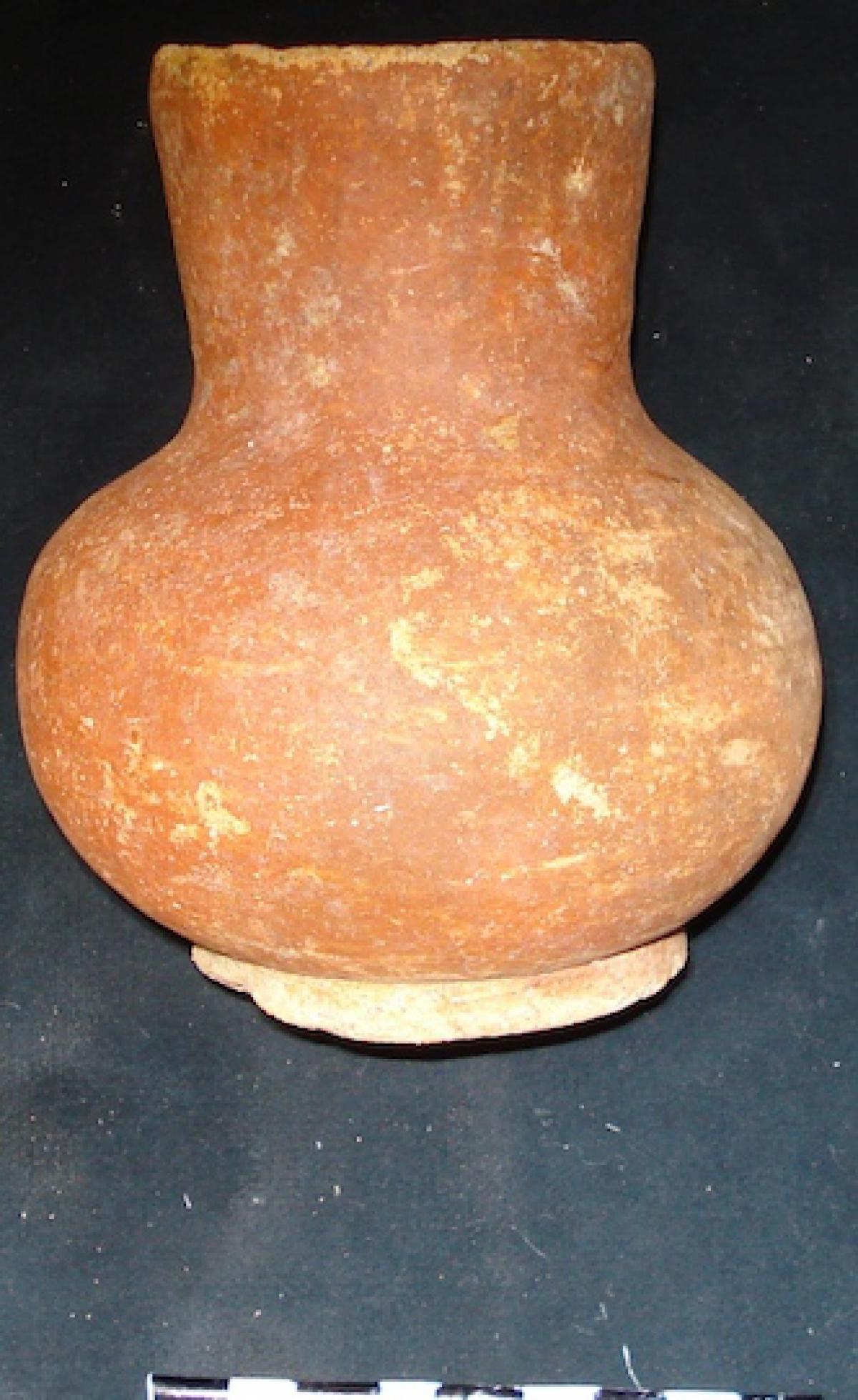 3565 - Jarra globular con base anular, cuello largo y borde recto. Engobe de color rojo en el exterior y engobe de color blanco sobre el cuello. Banda de color morado sobre el cuello.
