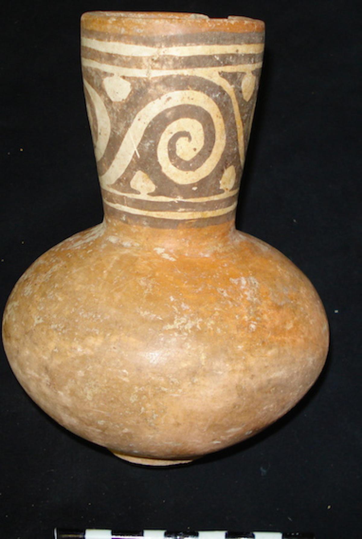 3639 - Jarra policroma globular de cuello largo. Presenta una decoración geométrica de espiral continua tipo “YC” a modo de friso en el cuello, y bandas alternas en zigzag sobre el cuerpo.