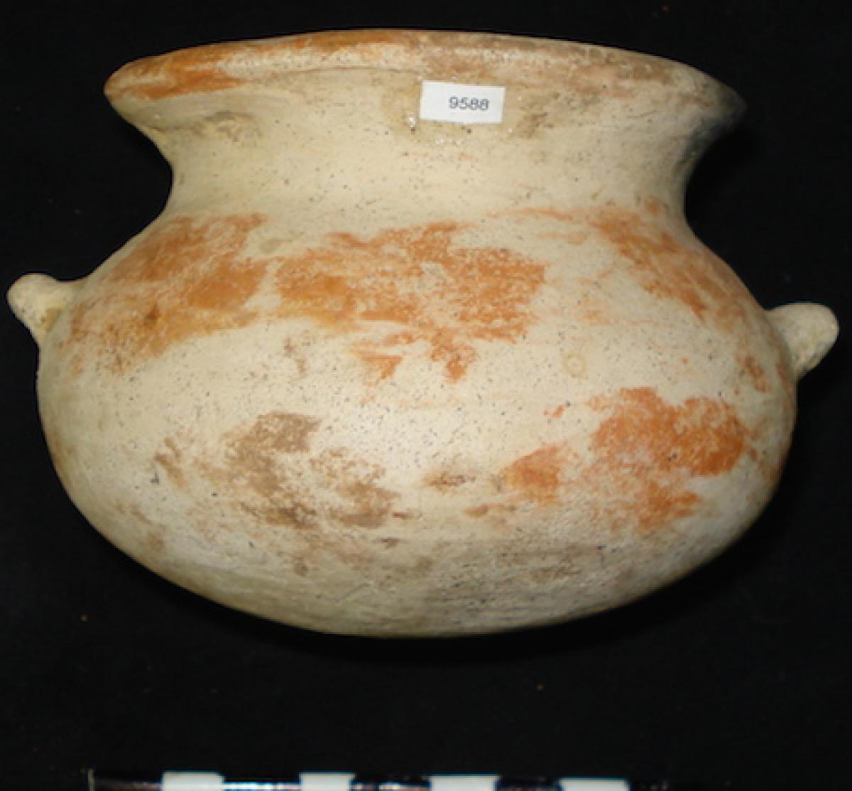 3619 - Olla globular de línea roja, sin soporte y con asa en el cuerpo.