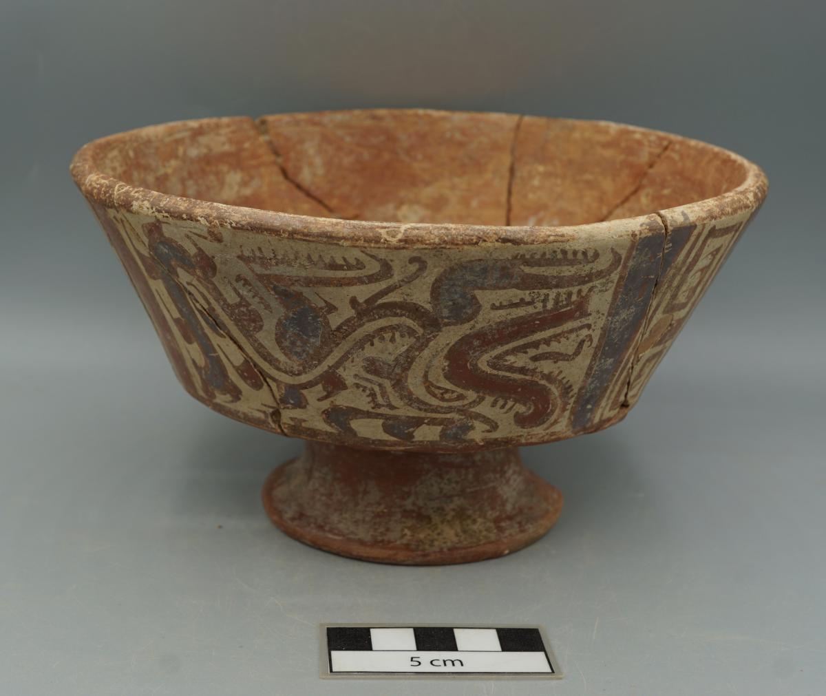 Cuenco circular sobre pedestal con paredes y borde convexos. Engobe rojo en el interior y exterior. Fue aplicado un segundo engobe de color blanco sobre las paredes exteriores y sobre él la decoración. Ésta consiste en una combinación de motivos zoomorfos (saurios de cuerpo serpentiforme) y geométricos (espirales dobles divergentes rectilíneas).