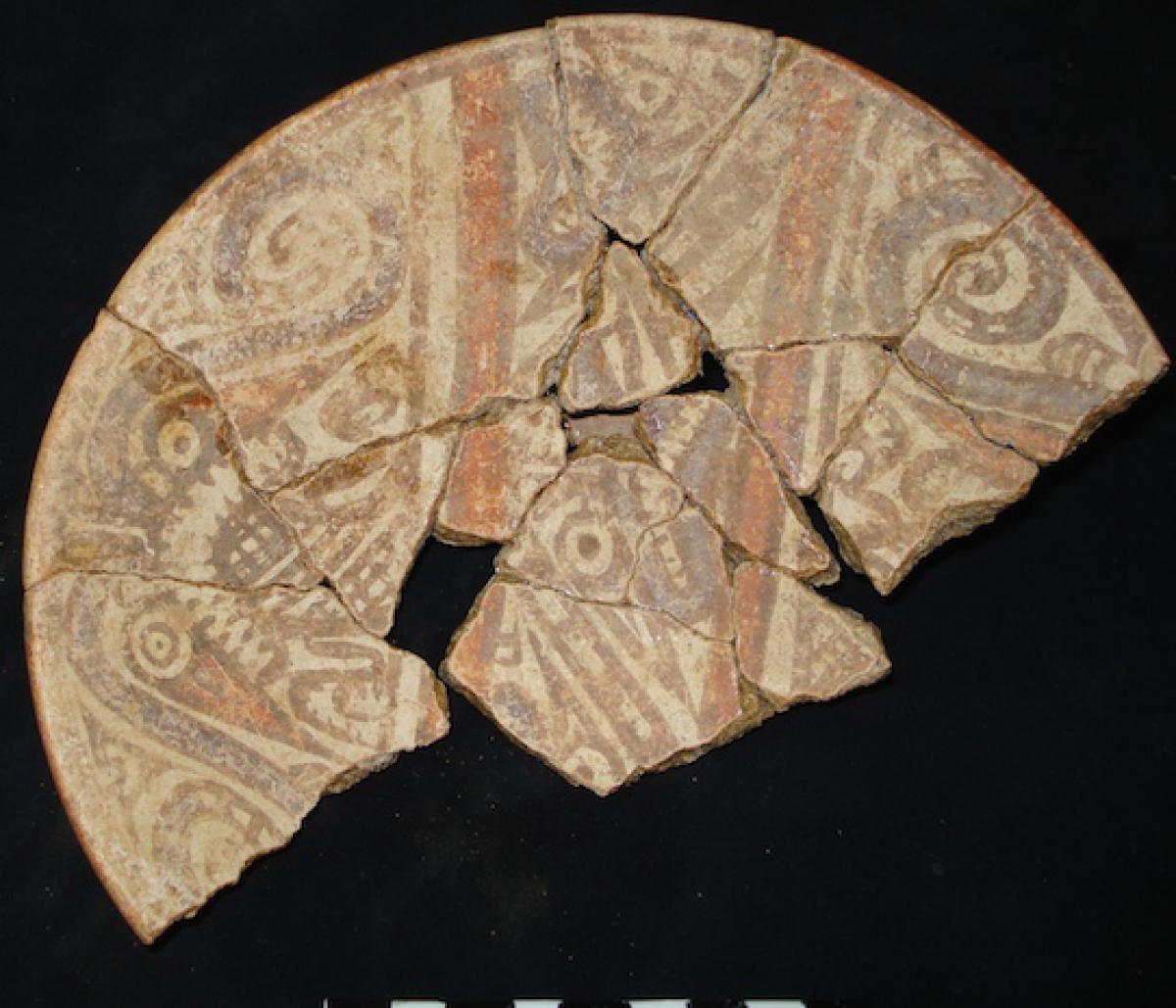 385 - Plato polícromo de borde engrosado exterior. Doble engobe (blanco en el anverso y rojo en el reverso) y decoración en bandas de color alternas zigzagueantes (rojo y morado).