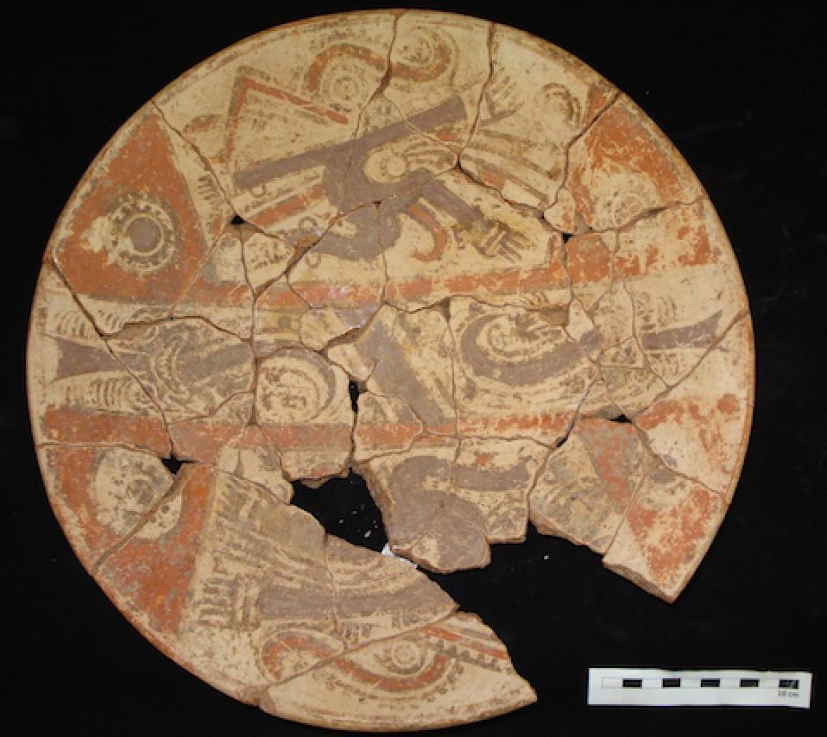 3658 - Cuenco de base plana, paredes ligeramente convexas y borde engrosado hacia el exterior, con engobe rojo externo y blanco interno, decorado con un panel central con la representación de un (...