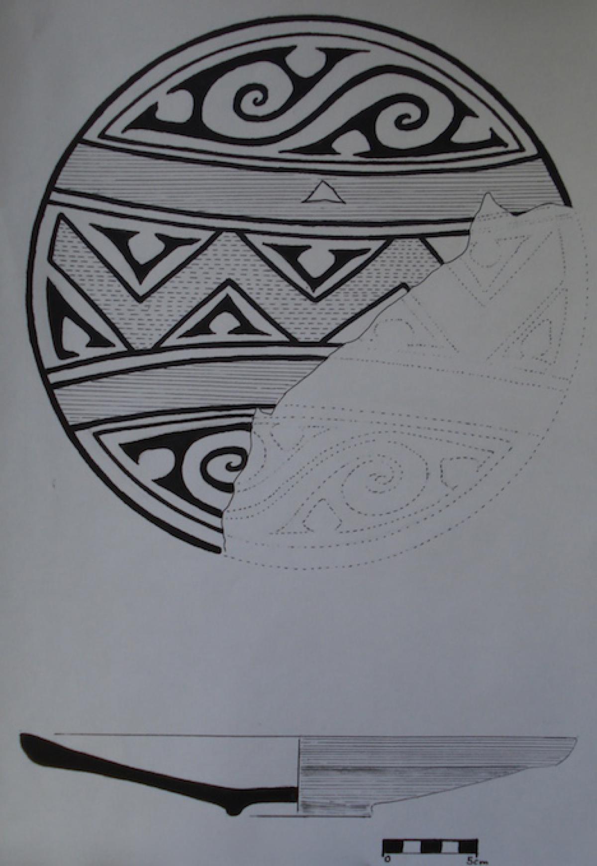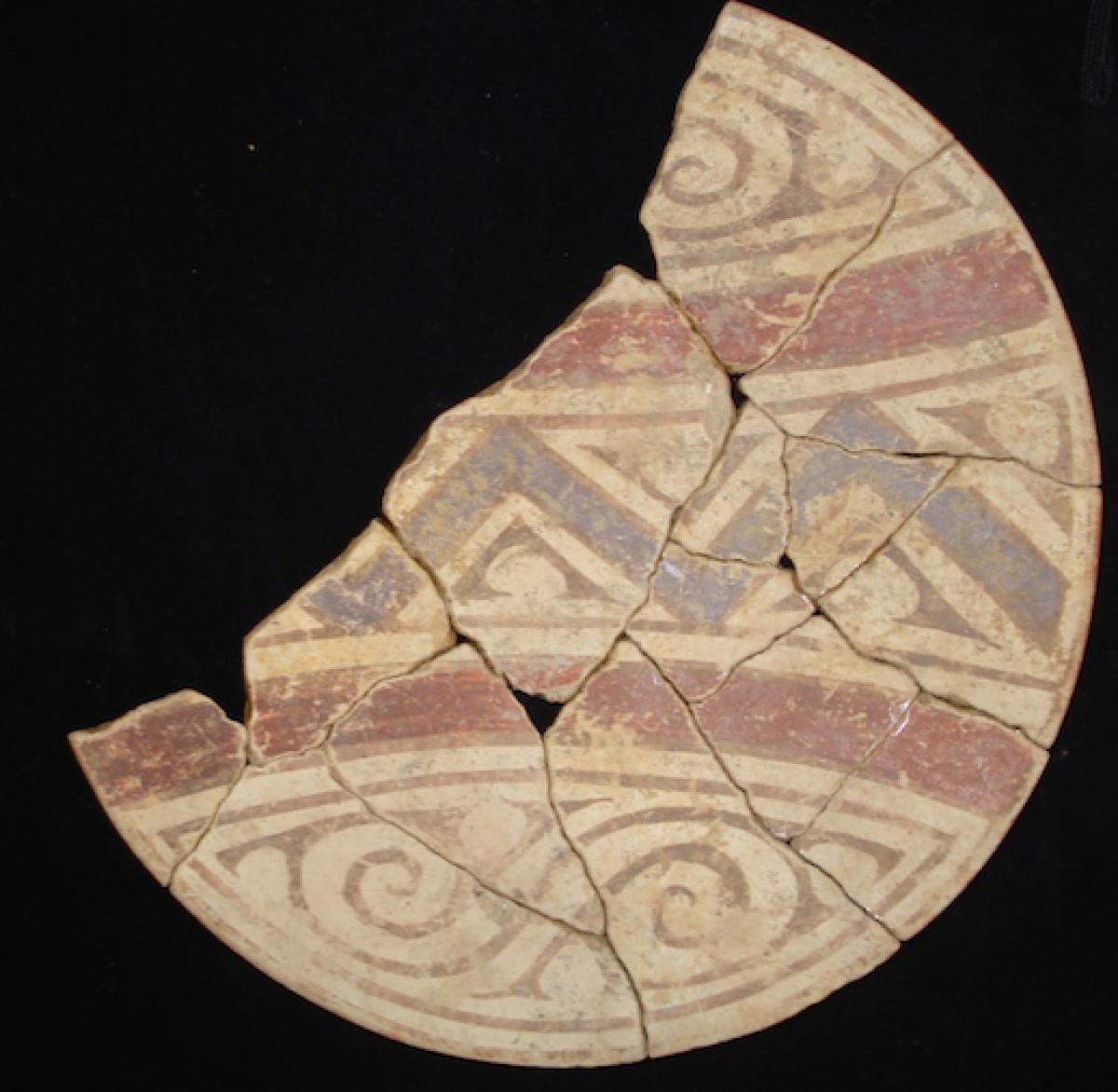 385 - Plato polícromo de borde engrosado exterior. Doble engobe (blanco en el anverso y rojo en el reverso) y decoración en bandas de color alternas zigzagueantes (rojo y morado).