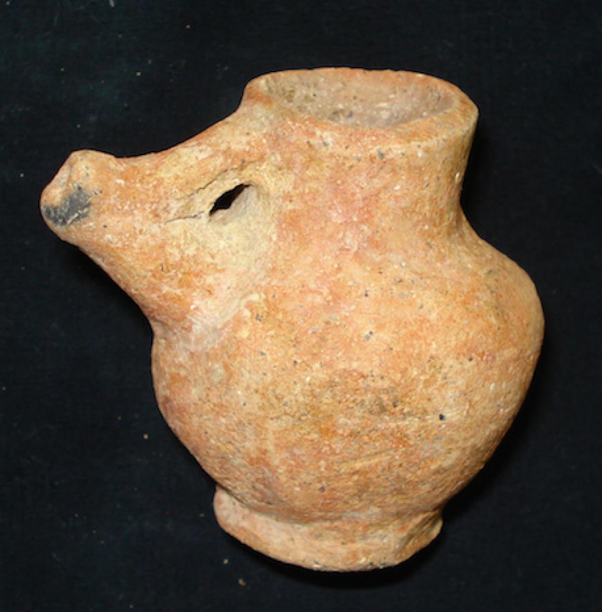 3651 - Jarra zoomorfa. Representa a un venado de cola blanca. Presenta engobe de color blanco en la zona inferior y rojo en la superior.
