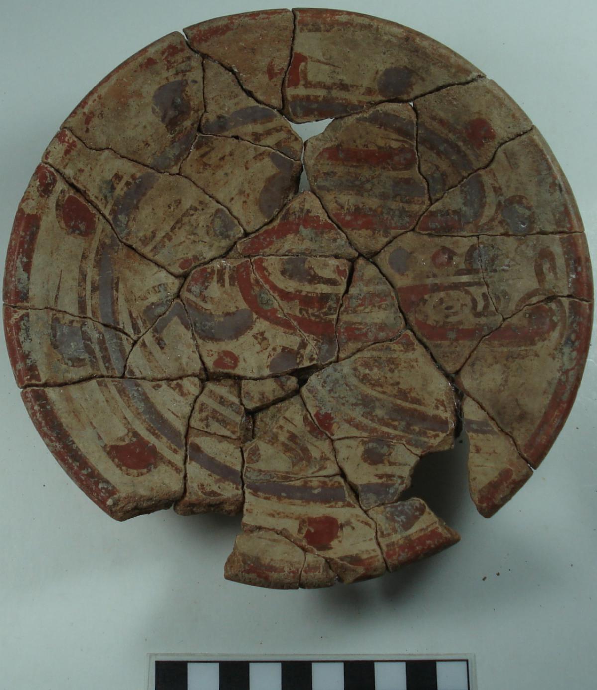 385 - Plato polícromo de borde engrosado exterior. Doble engobe (blanco en el anverso y rojo en el reverso) y decoración en bandas de color alternas zigzagueantes (rojo y morado).