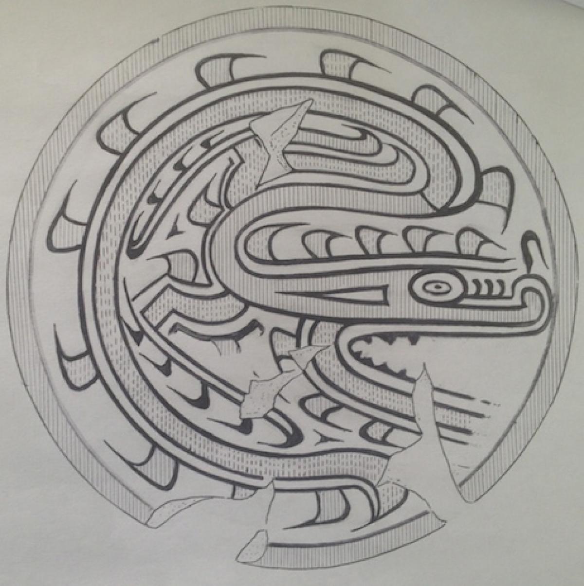 389 - Pectoral discoidal de oro repujado con la representación de un ser sobrenatural híbrido de calamar y ave. Grupo metalúrgico Conte. La figura del calamar, que es la más inmediata, ...