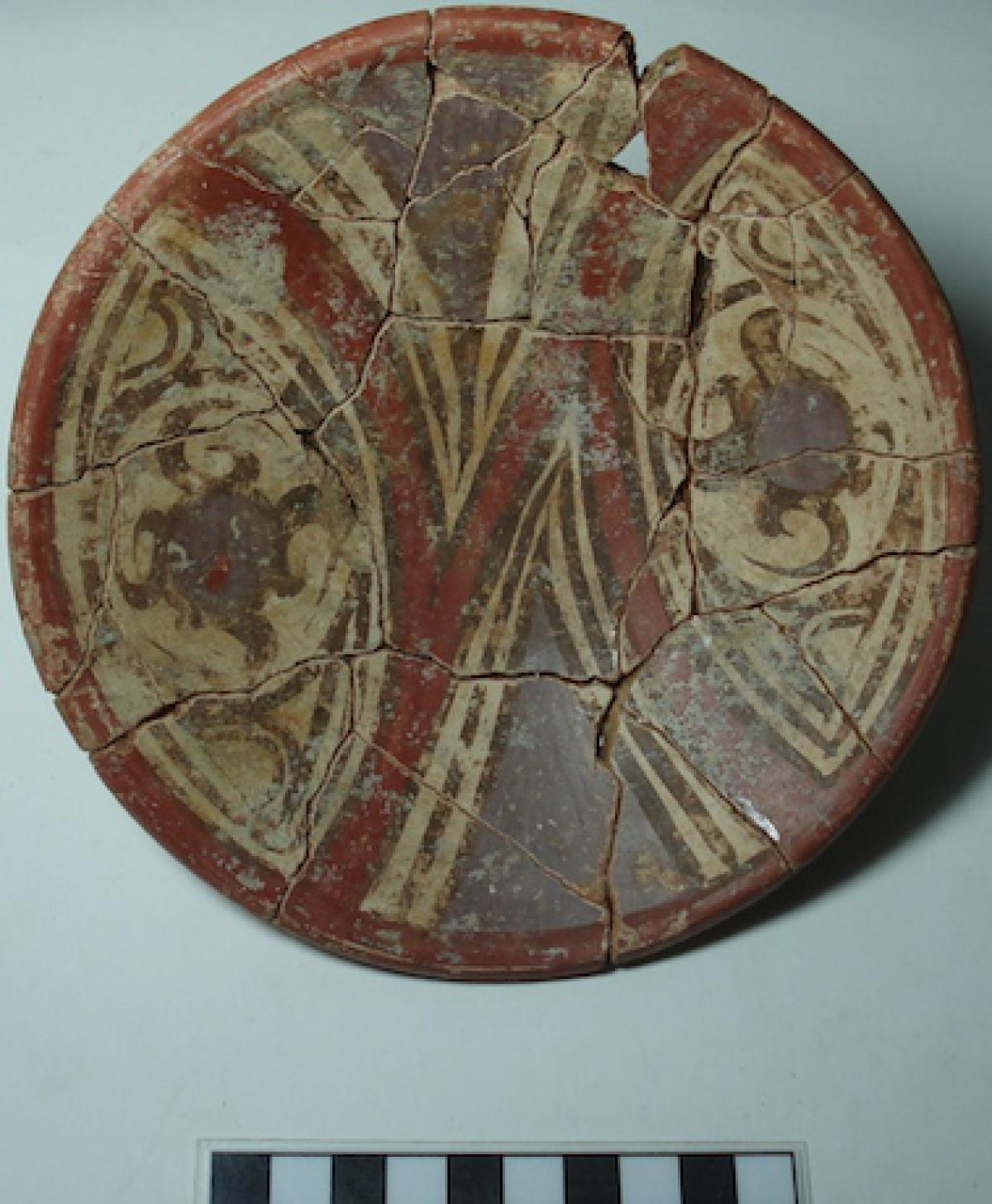 385 - Plato polícromo de borde engrosado exterior. Doble engobe (blanco en el anverso y rojo en el reverso) y decoración en bandas de color alternas zigzagueantes (rojo y morado).