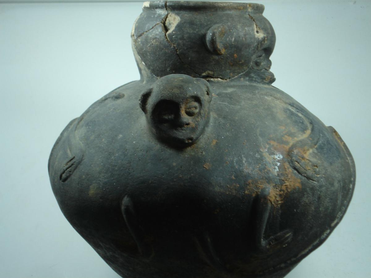 3636 - efigie antropomorfa. Cuerpo de tendencia globular sin base anular y sin asa de apoyo. La decoración en brazos y cara representan con pinturas corporales o tatuajes