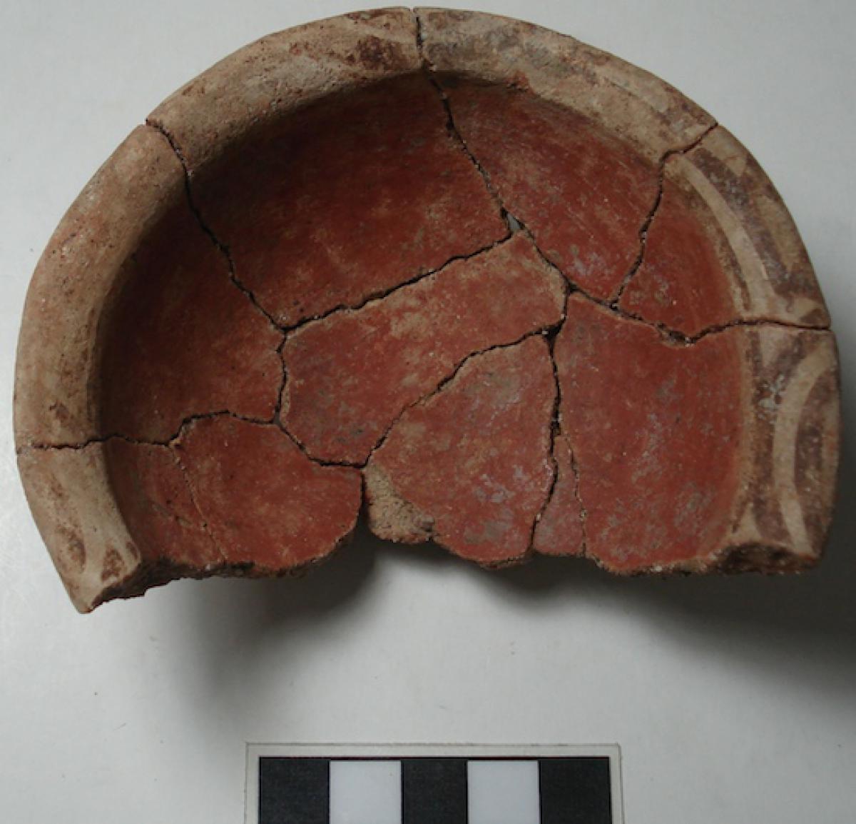 3658 - Cuenco de base plana, paredes ligeramente convexas y borde engrosado hacia el exterior, con engobe rojo externo y blanco interno, decorado con un panel central con la representación de un (...