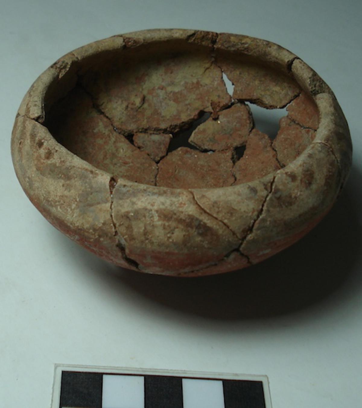 3658 - Cuenco de base plana, paredes ligeramente convexas y borde engrosado hacia el exterior, con engobe rojo externo y blanco interno, decorado con un panel central con la representación de un (...
