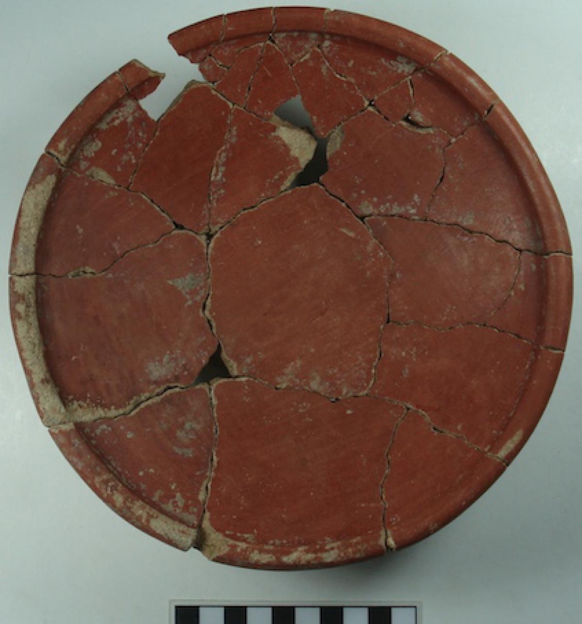 385 - Plato polícromo de borde engrosado exterior. Doble engobe (blanco en el anverso y rojo en el reverso) y decoración en bandas de color alternas zigzagueantes (rojo y morado).