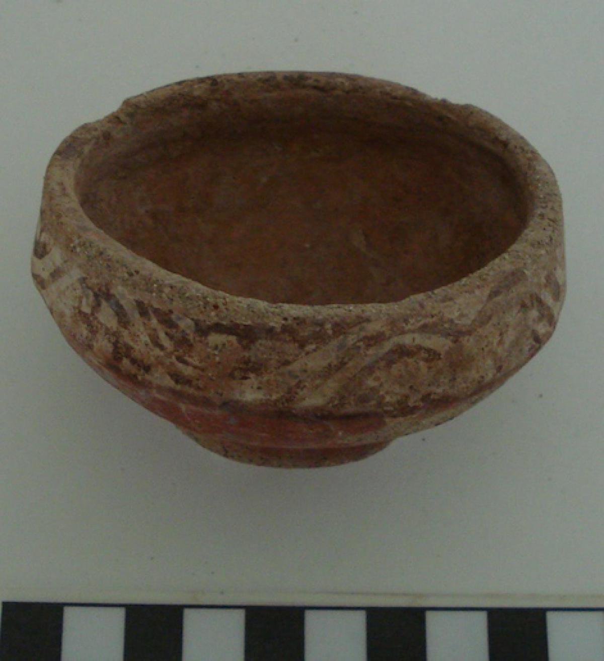 3658 - Cuenco de base plana, paredes ligeramente convexas y borde engrosado hacia el exterior, con engobe rojo externo y blanco interno, decorado con un panel central con la representación de un (...