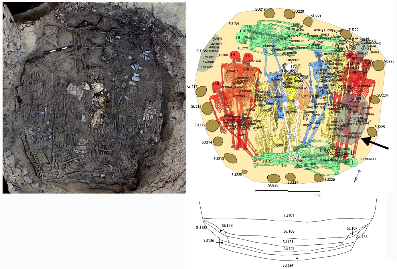 381 - T6-UE125 (a , (llamado en el año 2013, unidad UE167).Entierro de la tumba T6. Depósito de huesos humanos en posición primaria localizado a 3,48 m de profundidad. Es un entierro múltiple...