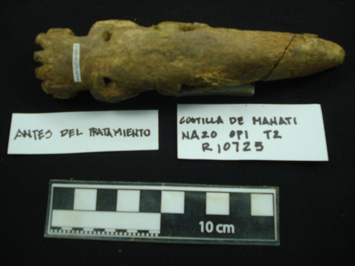 3606 - Hueso metapodiano trabajado de felino, parcialmente restaurado.