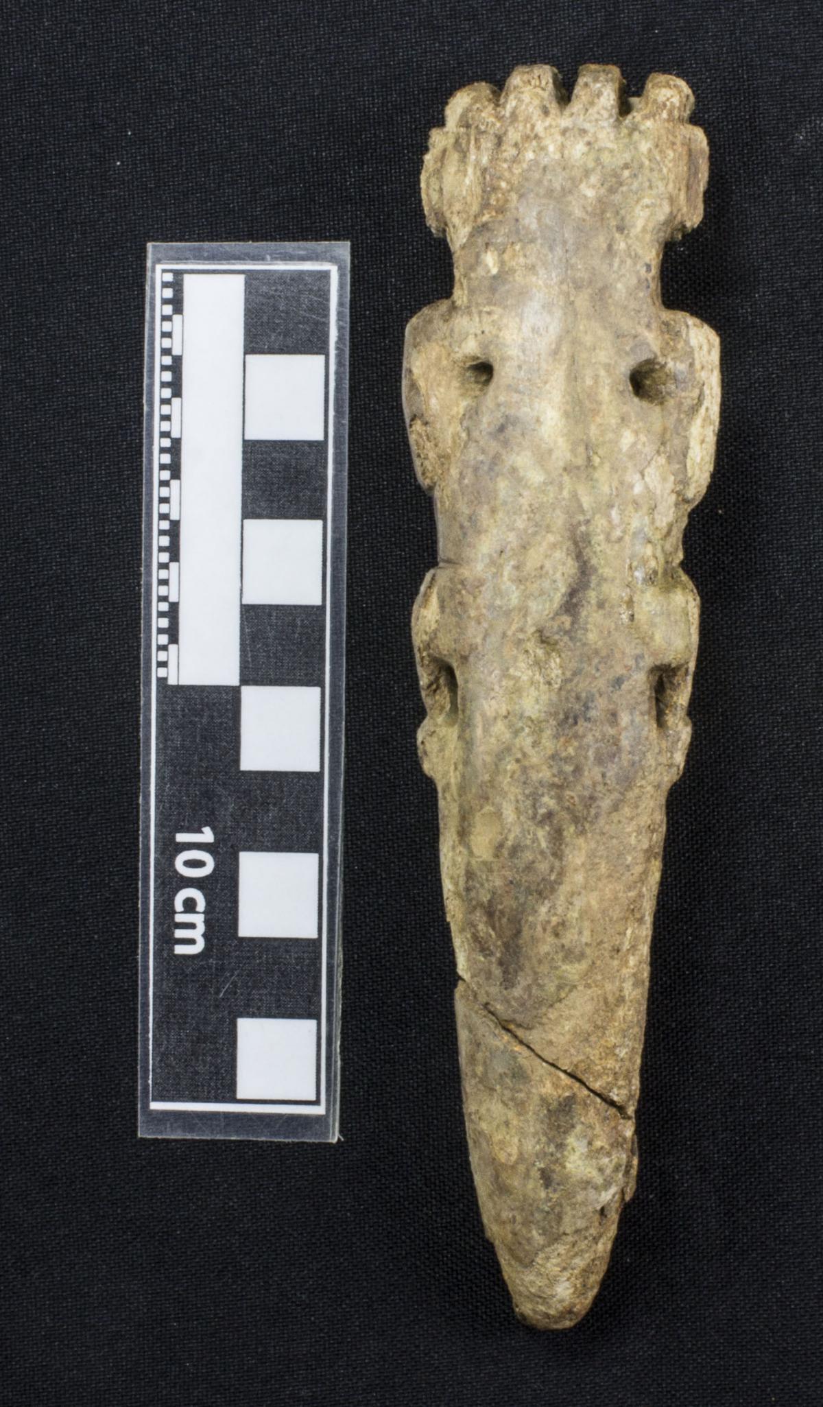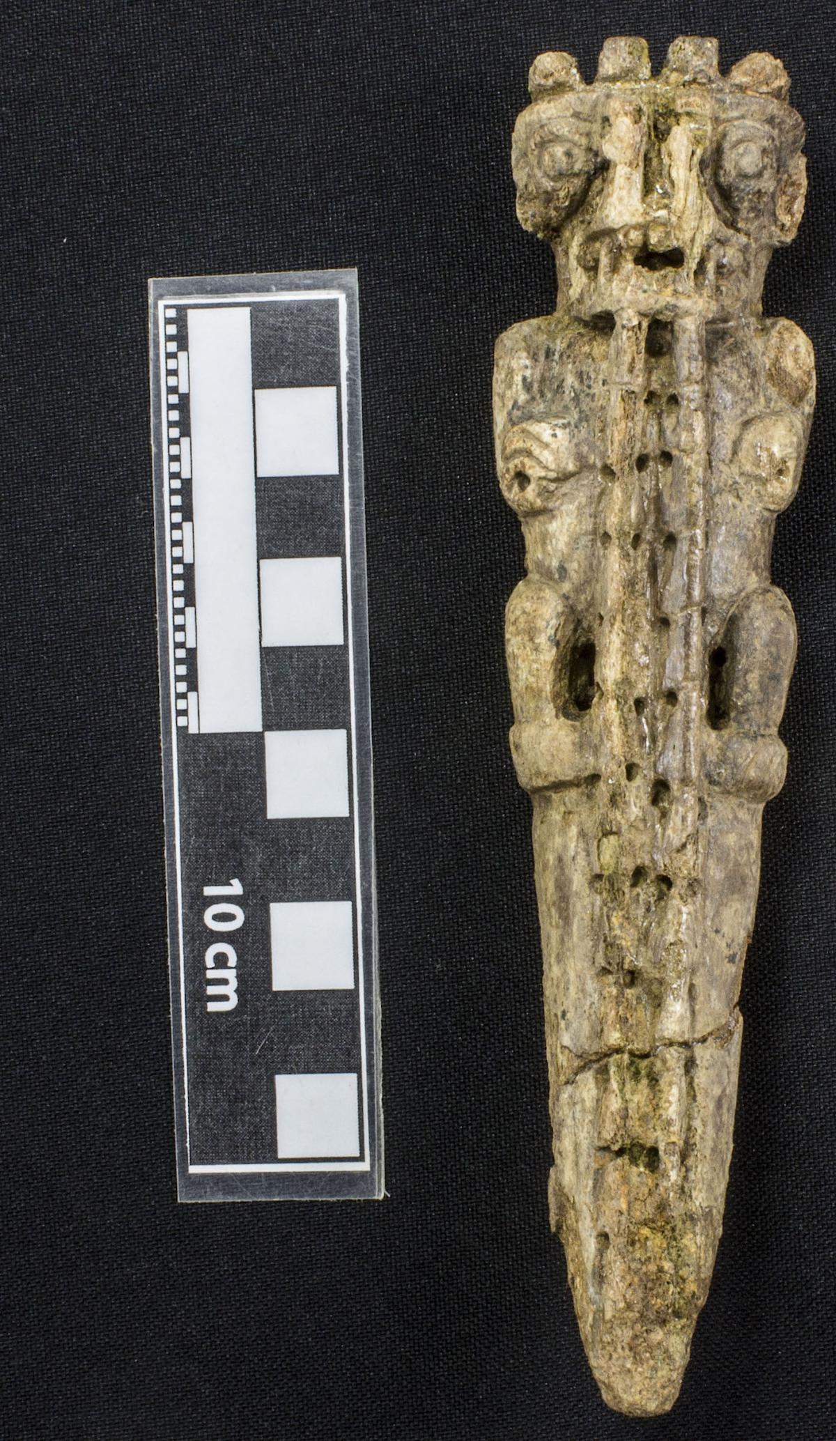 Costilla de manatí talla en forma de ser mítico con cresta, larga cola emplumada, garras, boca dentada y con largos colmillos. Vista anterior.