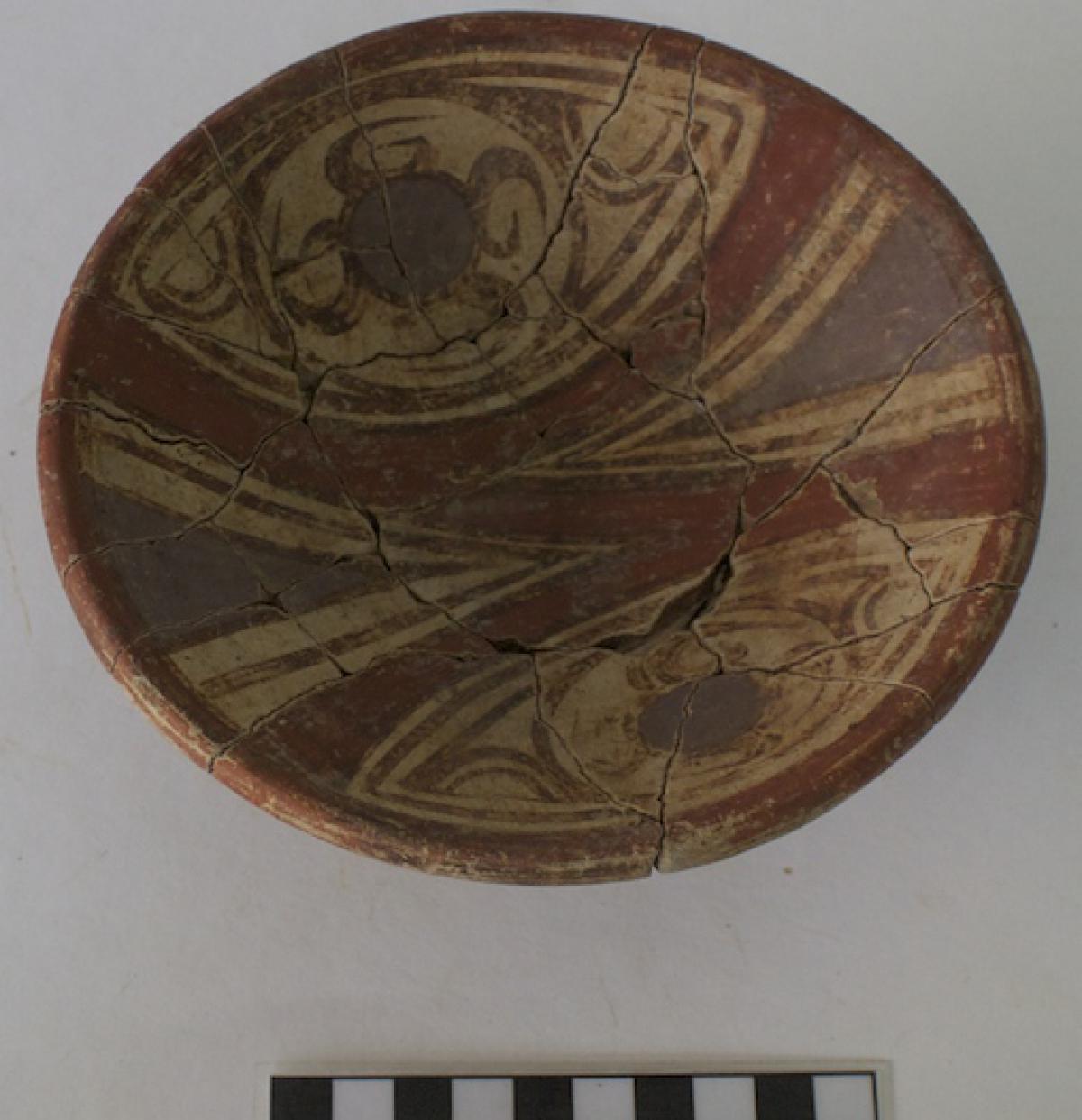 3658 - Cuenco de base plana, paredes ligeramente convexas y borde engrosado hacia el exterior, con engobe rojo externo y blanco interno, decorado con un panel central con la representación de un (...