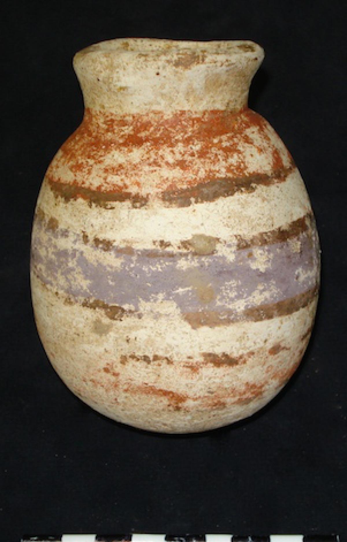 376 - Jarra polícroma carenada con hombros alzados y cuello largo. Engobe blanco y decoración de bandas de color alternas rojas y moradas.