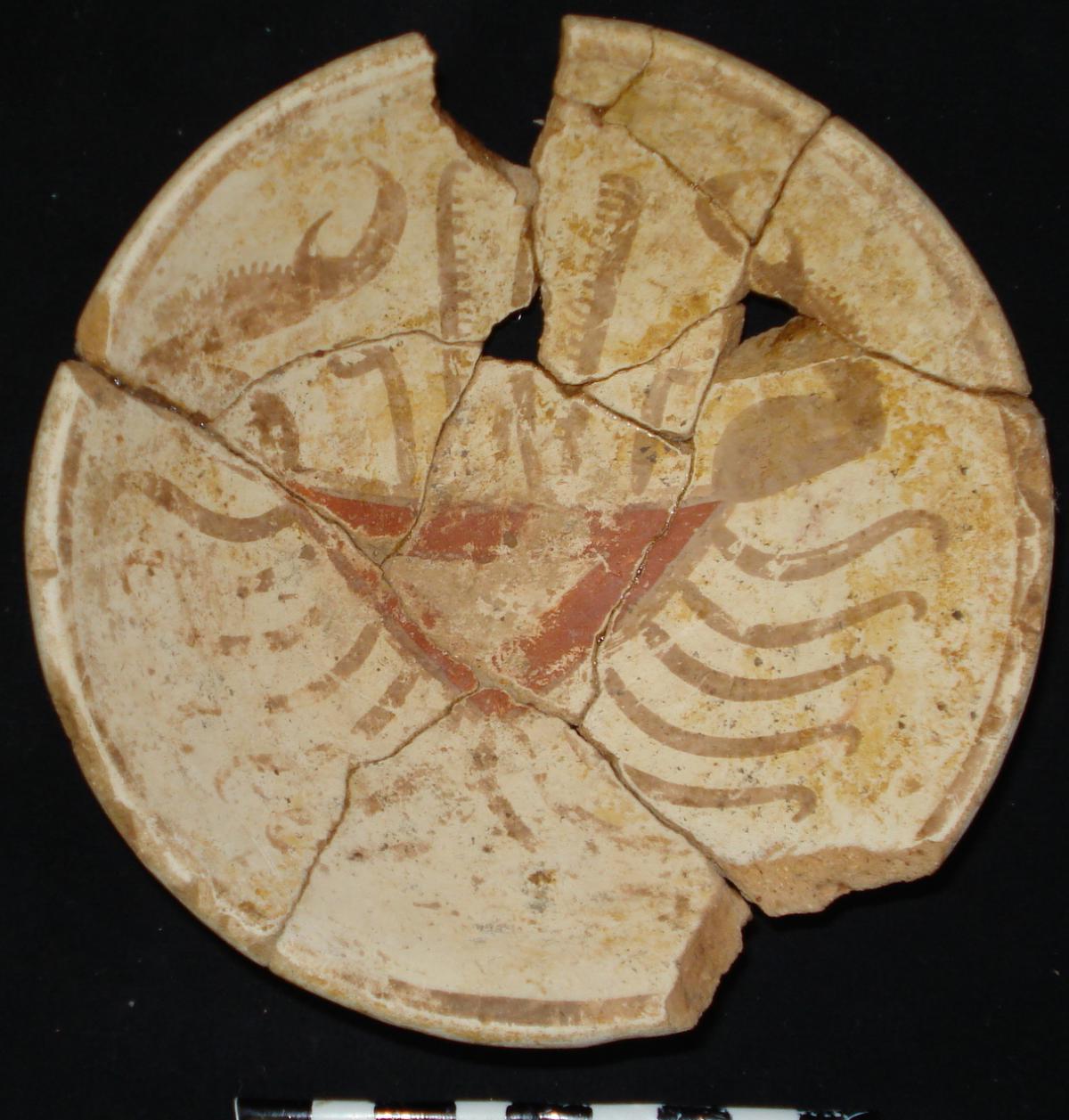 3655 - Cuenco policromo de base plana (sin soporte), con borde engrosado. Presenta engobe rojo en el exterior y blanco en el interior, con la representación de un cangrejo central y paneles geomé...