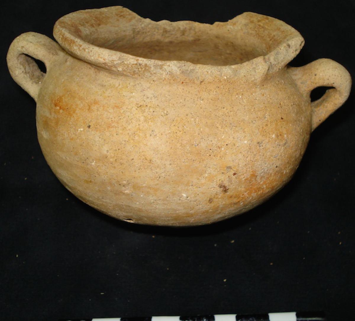 3560 - Olla con borde envesado, con línea roja y asa en el cuerpo, sin soporte.