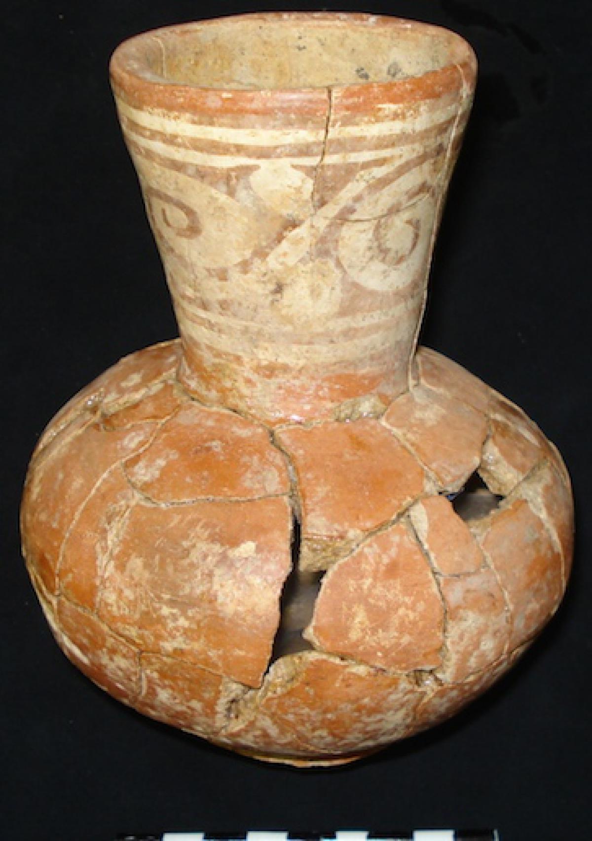 3565 - Jarra globular con base anular, cuello largo y borde recto. Engobe de color rojo en el exterior y engobe de color blanco sobre el cuello. Banda de color morado sobre el cuello.