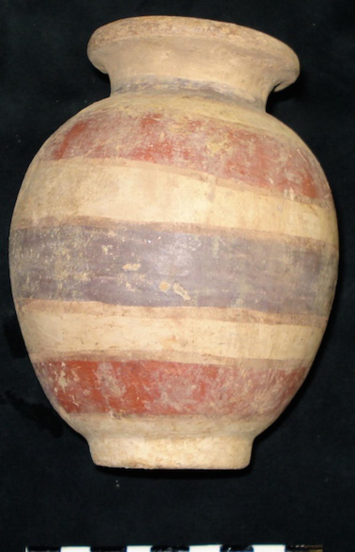376 - Jarra polícroma carenada con hombros alzados y cuello largo. Engobe blanco y decoración de bandas de color alternas rojas y moradas.