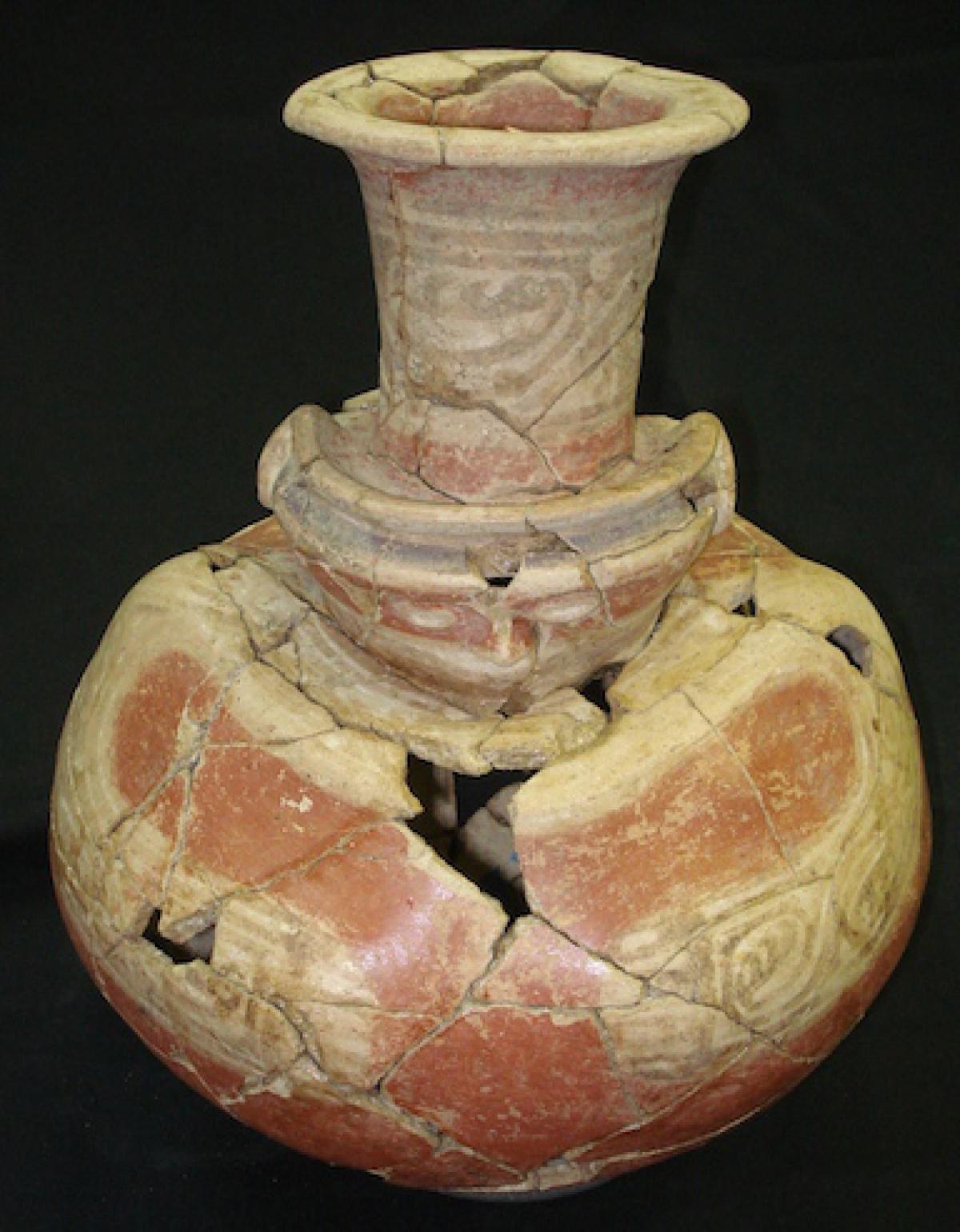 376 - Jarra polícroma carenada con hombros alzados y cuello largo. Engobe blanco y decoración de bandas de color alternas rojas y moradas.