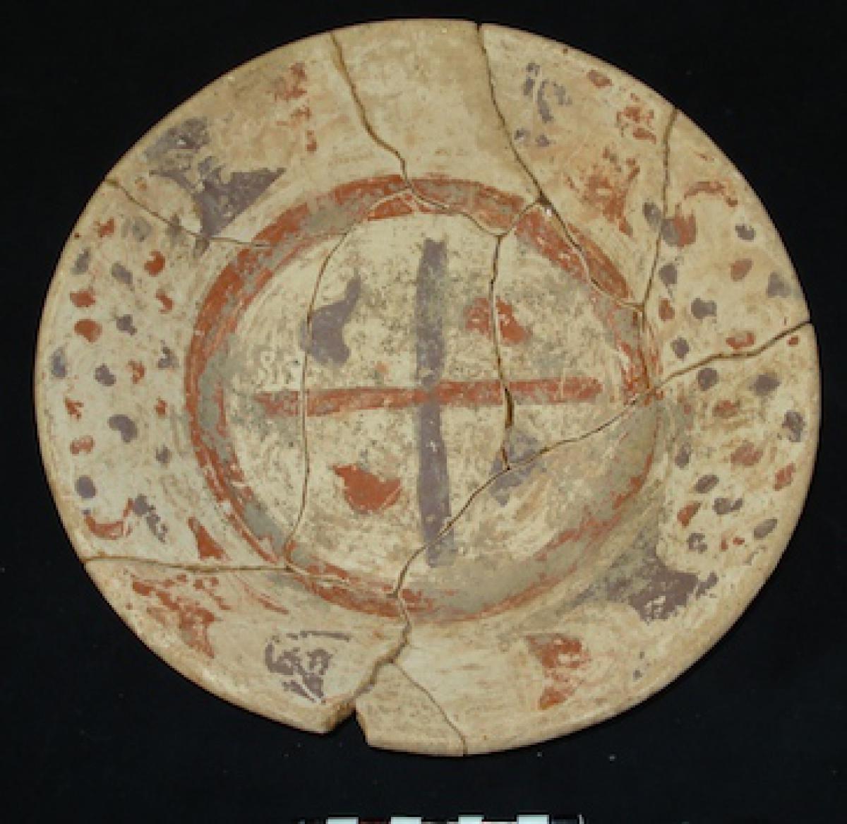 385 - Plato polícromo de borde engrosado exterior. Doble engobe (blanco en el anverso y rojo en el reverso) y decoración en bandas de color alternas zigzagueantes (rojo y morado).