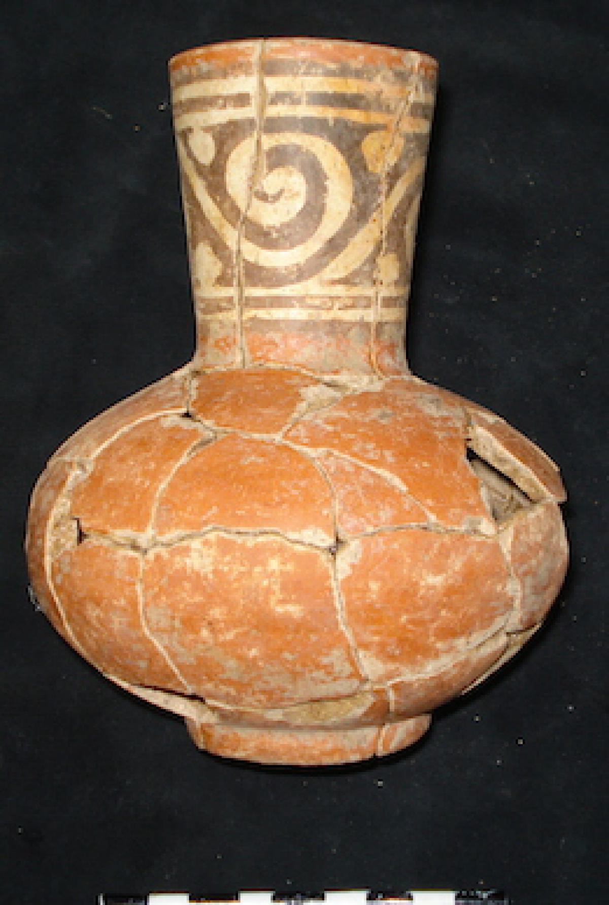 3639 - Jarra policroma globular de cuello largo. Presenta una decoración geométrica de espiral continua tipo “YC” a modo de friso en el cuello, y bandas alternas en zigzag sobre el cuerpo.
