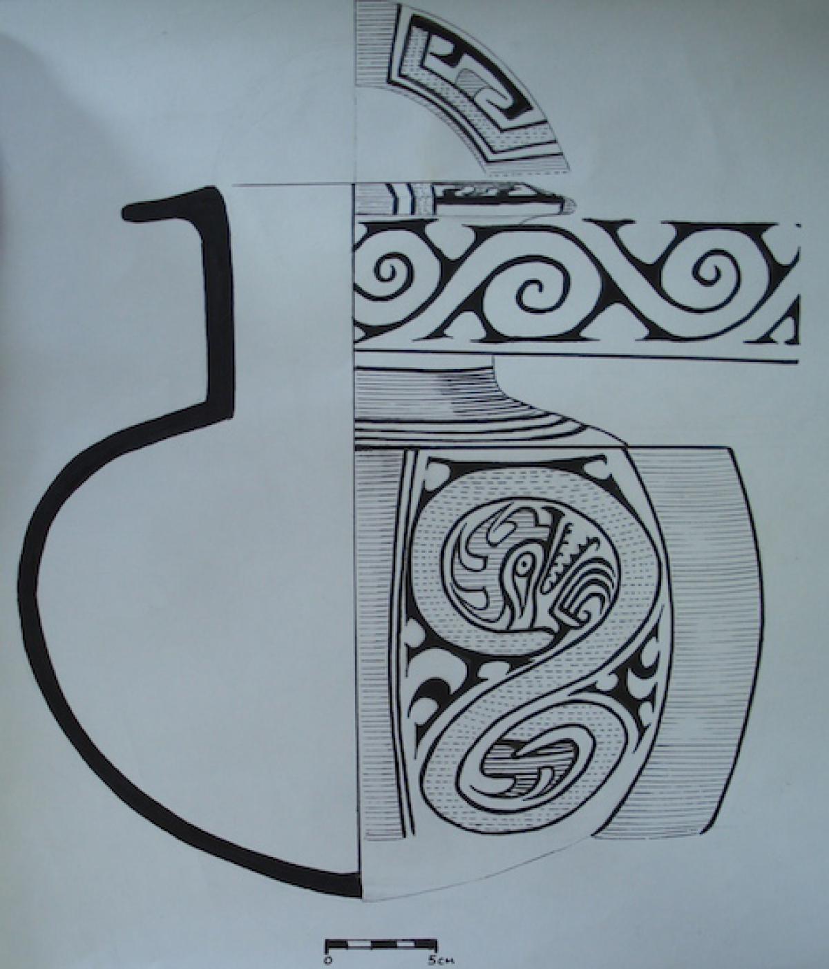 3639 - Jarra policroma globular de cuello largo. Presenta una decoración geométrica de espiral continua tipo “YC” a modo de friso en el cuello, y bandas alternas en zigzag sobre el cuerpo.