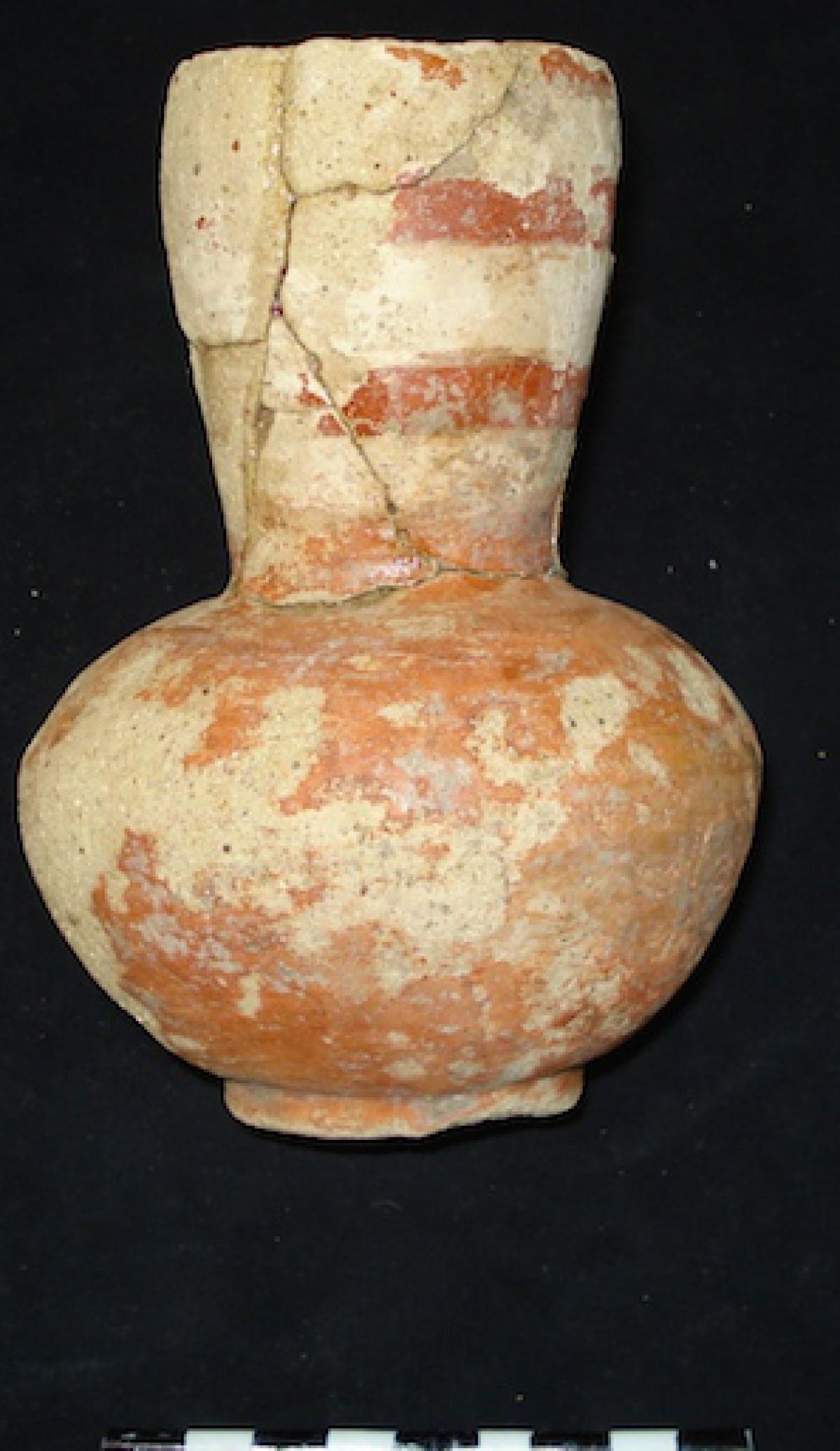 3565 - Jarra globular con base anular, cuello largo y borde recto. Engobe de color rojo en el exterior y engobe de color blanco sobre el cuello. Banda de color morado sobre el cuello.