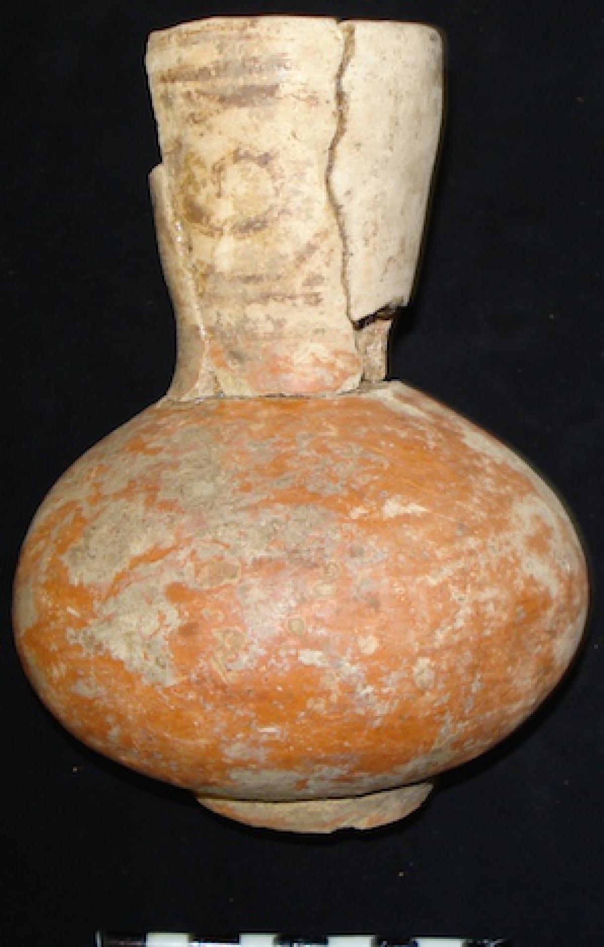 3565 - Jarra globular con base anular, cuello largo y borde recto. Engobe de color rojo en el exterior y engobe de color blanco sobre el cuello. Banda de color morado sobre el cuello.
