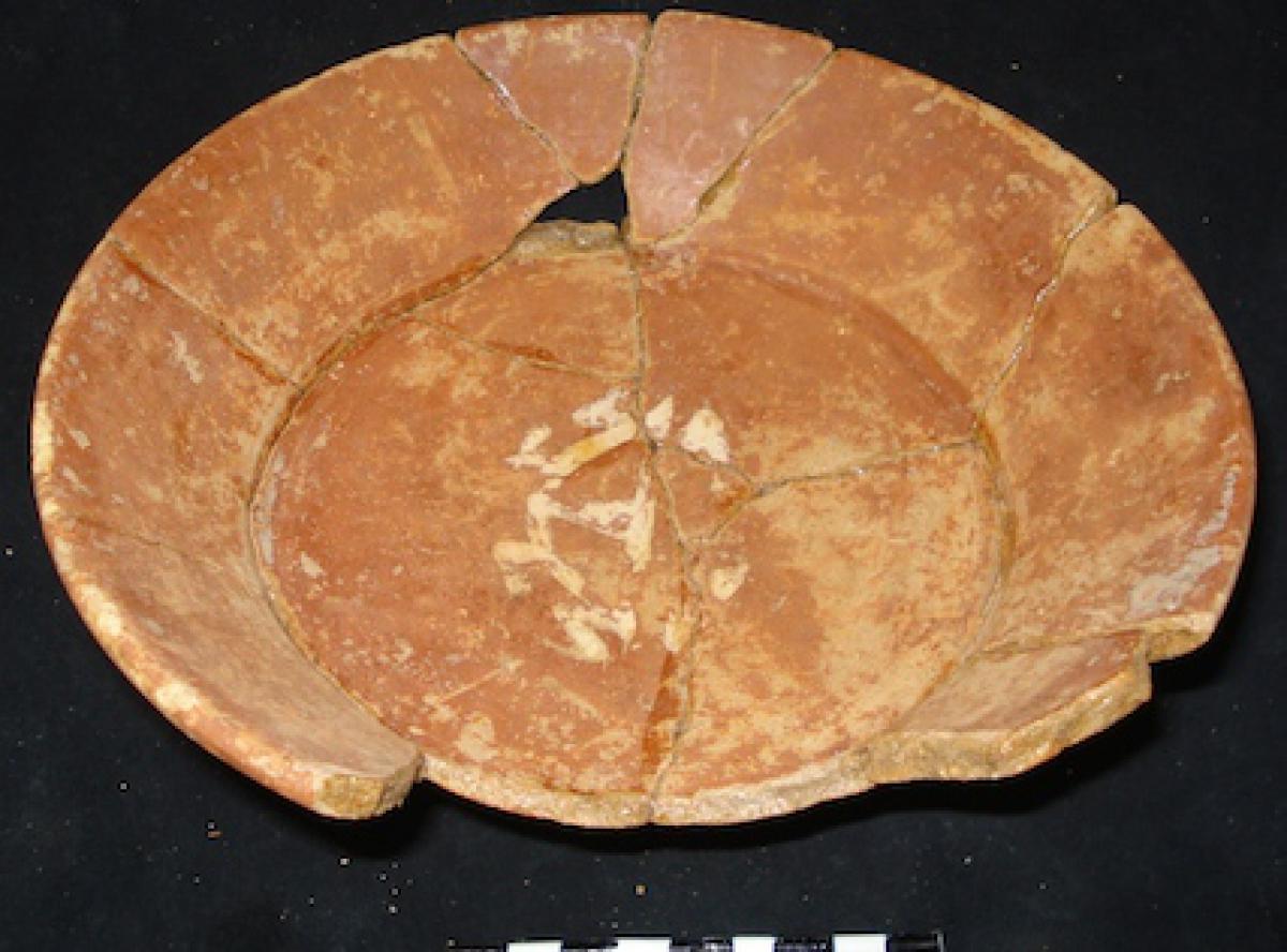 3658 - Cuenco de base plana, paredes ligeramente convexas y borde engrosado hacia el exterior, con engobe rojo externo y blanco interno, decorado con un panel central con la representación de un (...
