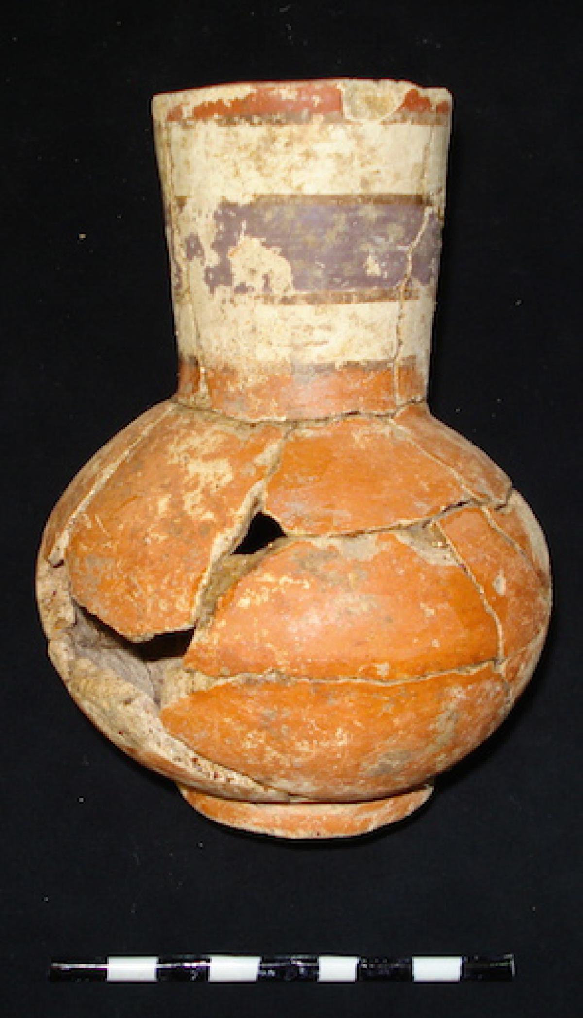 3565 - Jarra globular con base anular, cuello largo y borde recto. Engobe de color rojo en el exterior y engobe de color blanco sobre el cuello. Banda de color morado sobre el cuello.