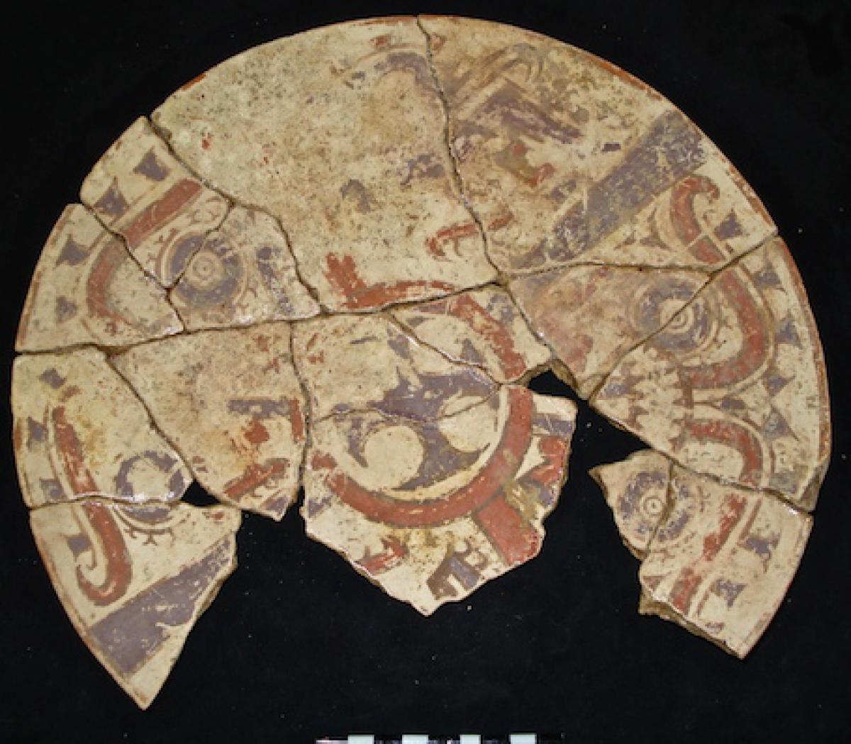 385 - Plato polícromo de borde engrosado exterior. Doble engobe (blanco en el anverso y rojo en el reverso) y decoración en bandas de color alternas zigzagueantes (rojo y morado).