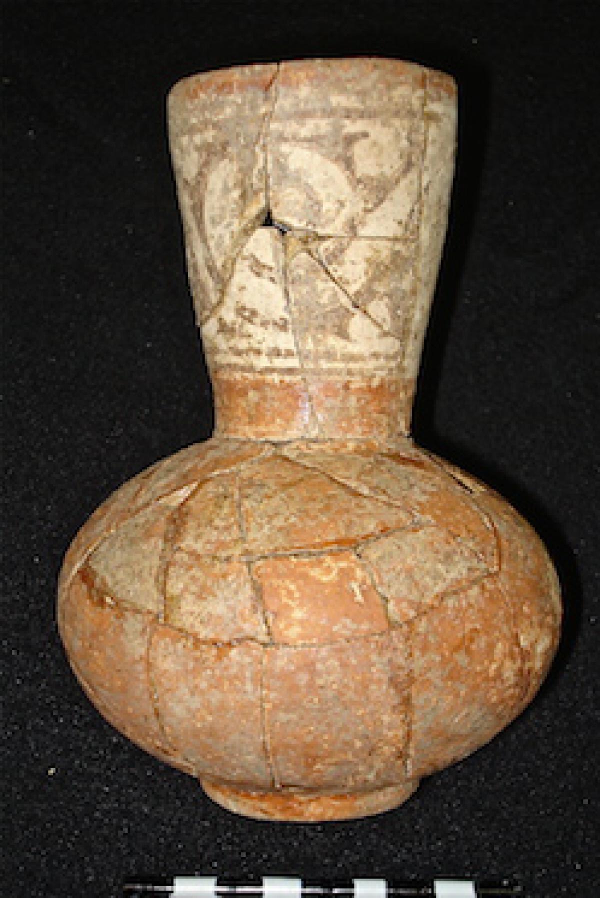 376 - Jarra polícroma carenada con hombros alzados y cuello largo. Engobe blanco y decoración de bandas de color alternas rojas y moradas.