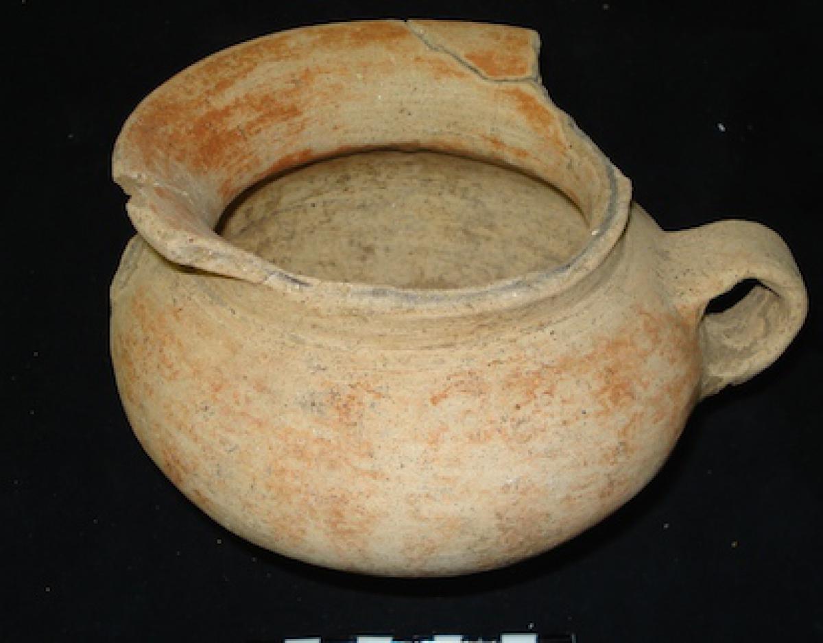 3619 - Olla globular de línea roja, sin soporte y con asa en el cuerpo.