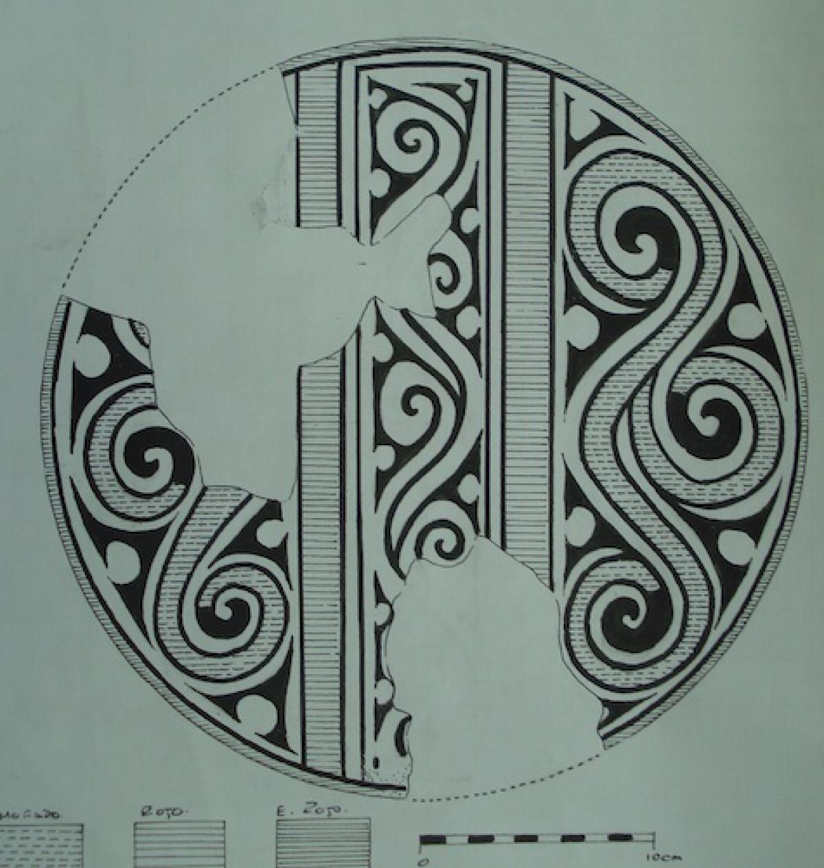 384 - Cuenco carenado cerrado de doble englobe (rojo y blanco). Decoración geométrica de espirales "yc".