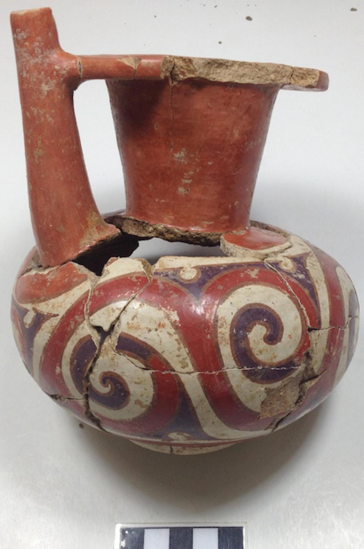 376 - Jarra polícroma carenada con hombros alzados y cuello largo. Engobe blanco y decoración de bandas de color alternas rojas y moradas.