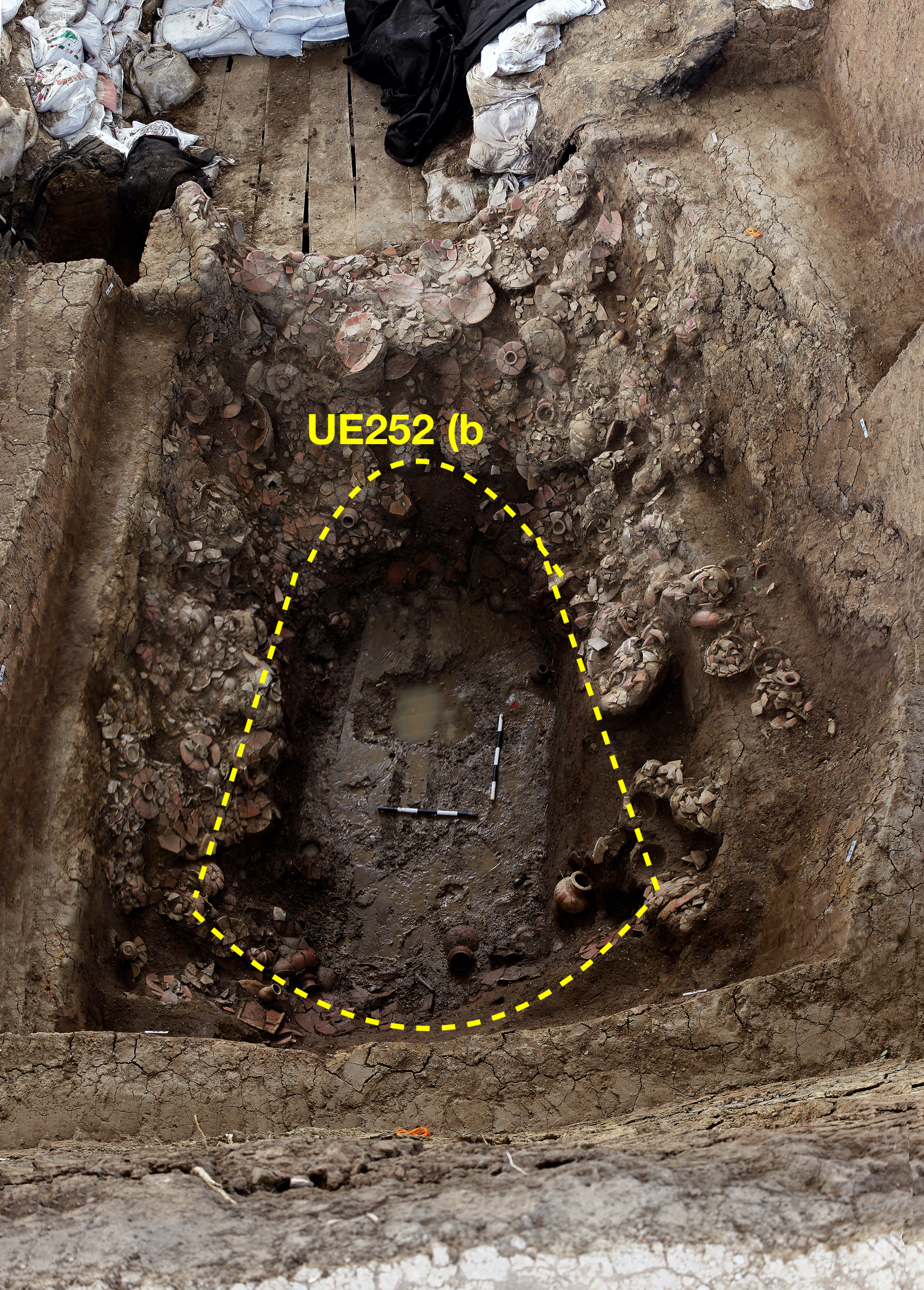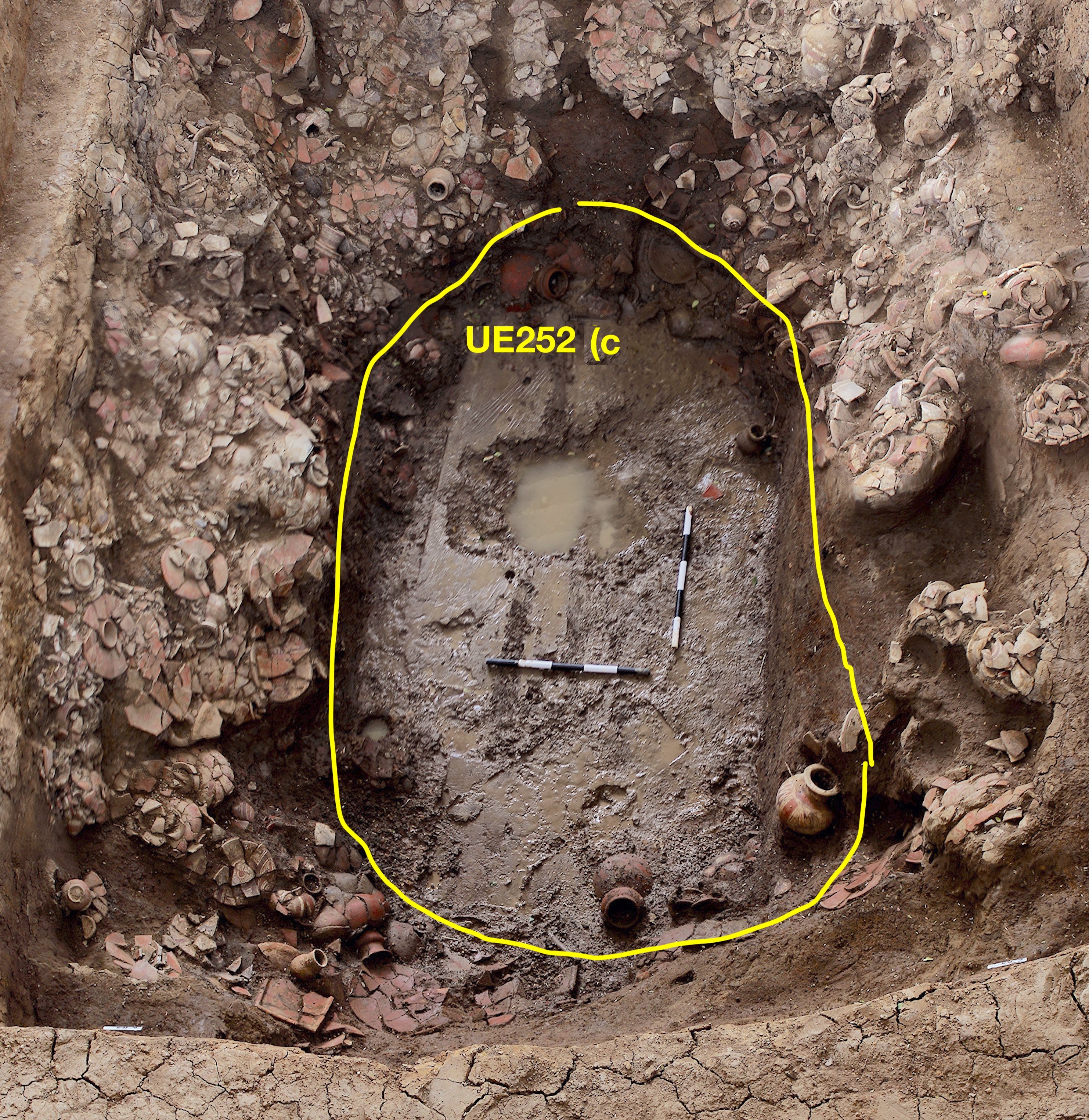Tras colapsar la base de la ofrenda, solo una pequeña porción de las ofrendas permanecieron en su posición original. Esta sección ha sido identificada como UE252 (a.