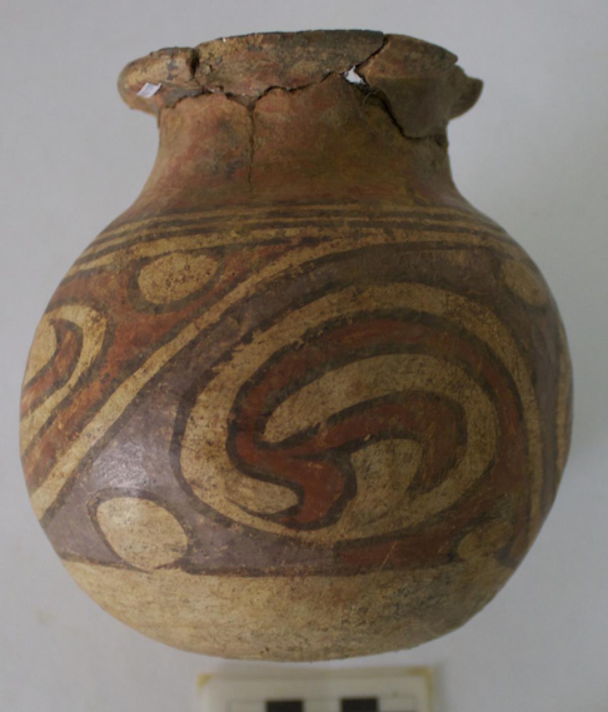 3639 - Jarra policroma globular de cuello largo. Presenta una decoración geométrica de espiral continua tipo “YC” a modo de friso en el cuello, y bandas alternas en zigzag sobre el cuerpo.