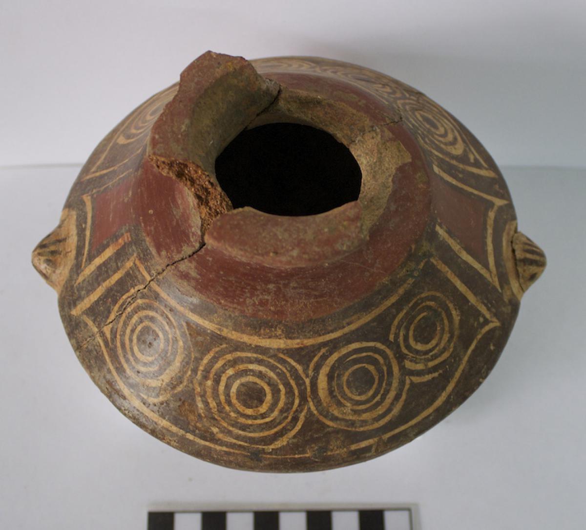 3612 - Jarra de cuerpo globular, policroma, con cuello corto, base anular y borde anguloso.