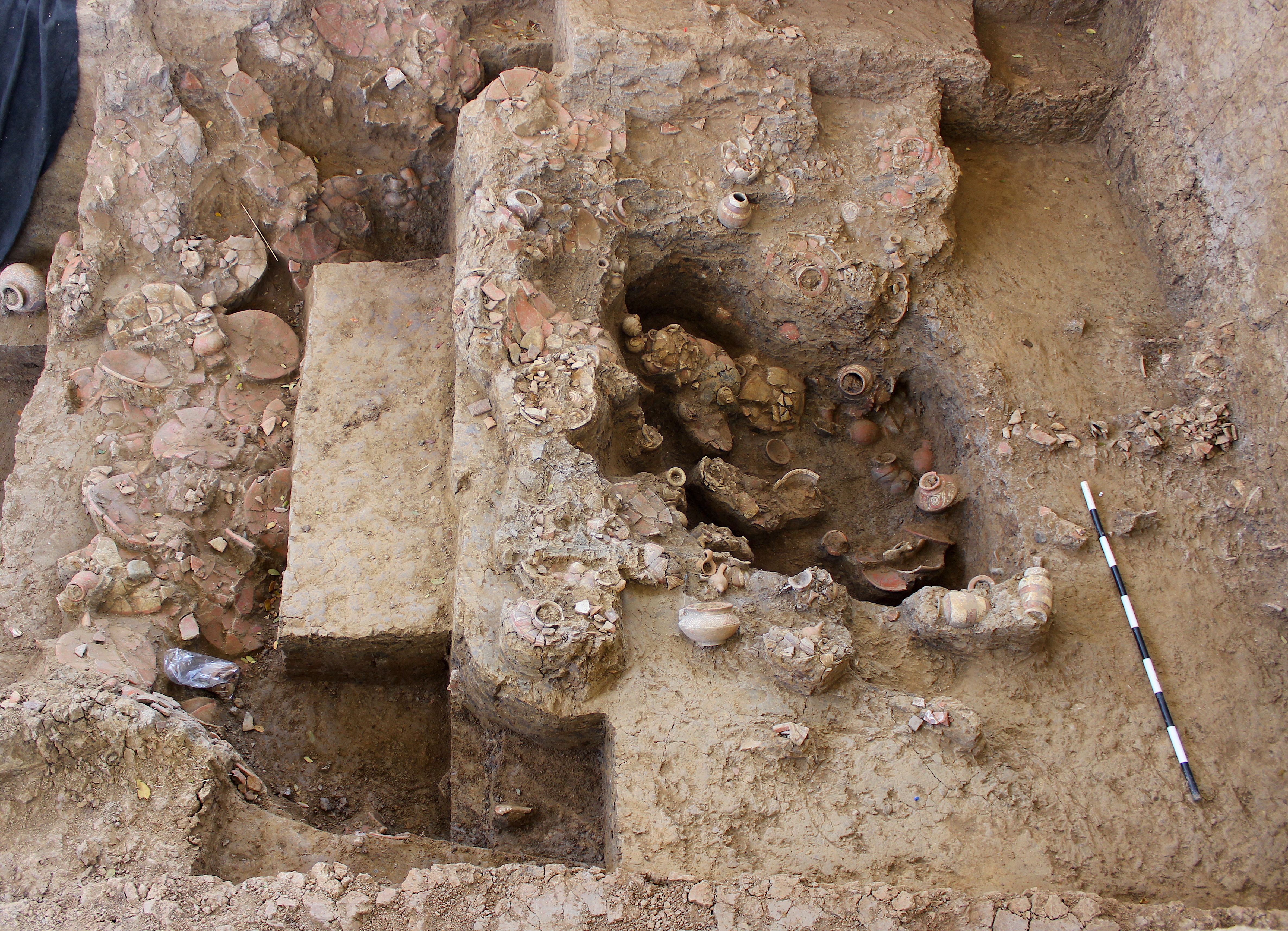 375 - T2-UE088. Depósito de artefactos y osamentas localizado a una profundidad de 2,20 m sobre la Plataforma II (piso más alto) de la tumba T2. Todos los cuerpos fueron colocados en decúbito v...