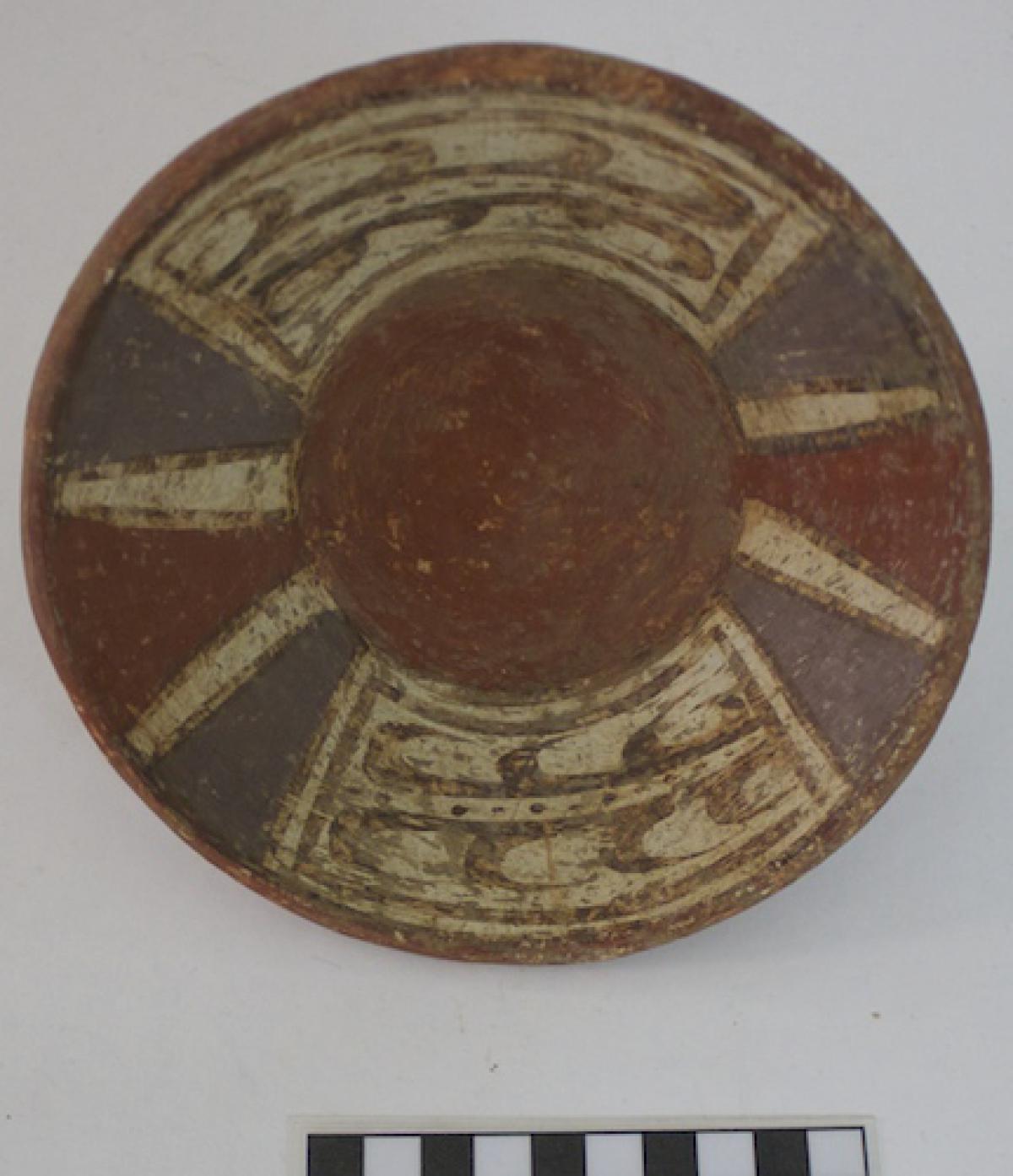 385 - Plato polícromo de borde engrosado exterior. Doble engobe (blanco en el anverso y rojo en el reverso) y decoración en bandas de color alternas zigzagueantes (rojo y morado).