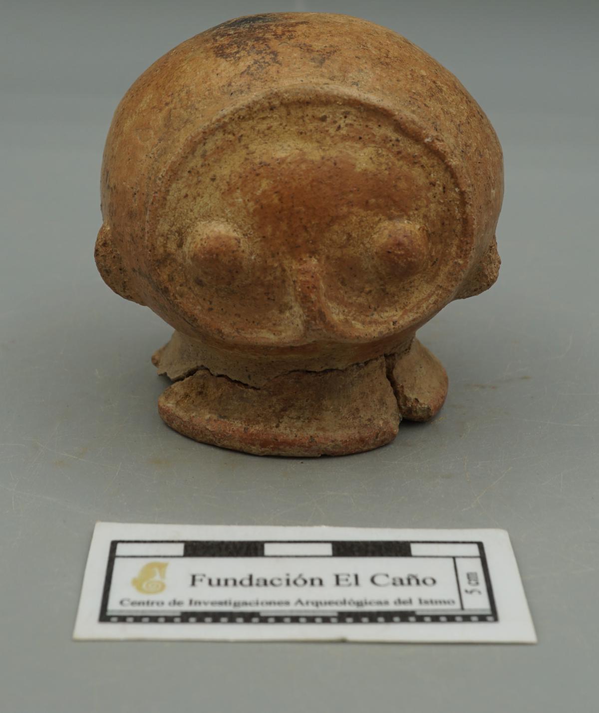 Vasija zoomorfa. Representa la cabeza de un búho. Presenta un engobe de color crema sobre el cual fueron pintadas pequeñas franjas de color blanco.