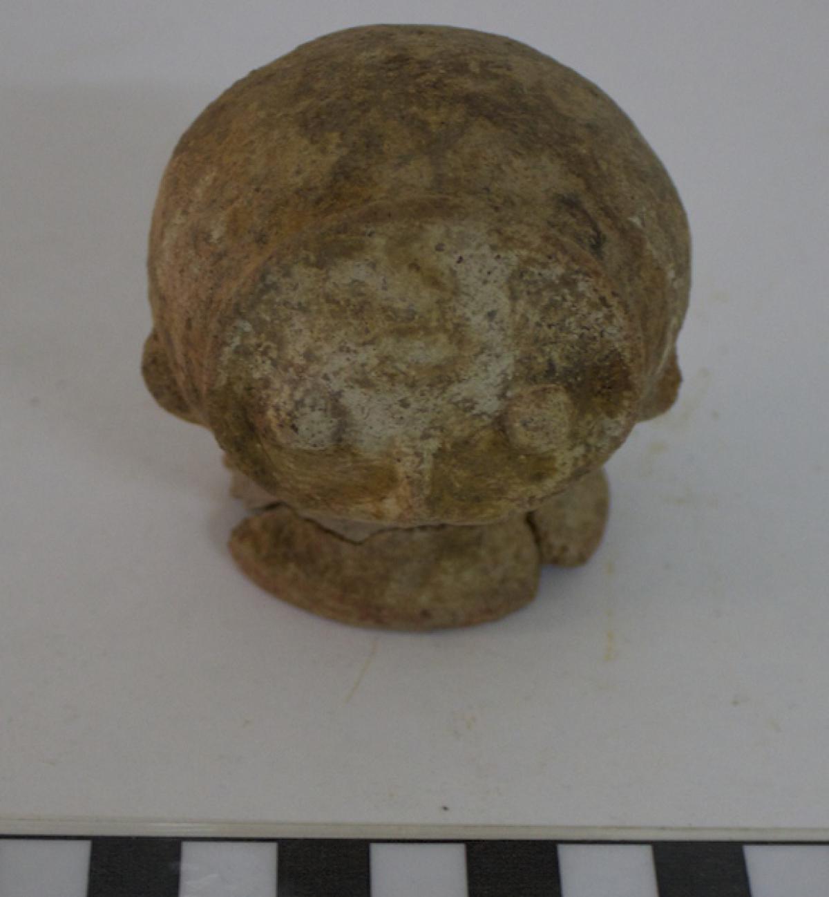 3636 - efigie antropomorfa. Cuerpo de tendencia globular sin base anular y sin asa de apoyo. La decoración en brazos y cara representan con pinturas corporales o tatuajes