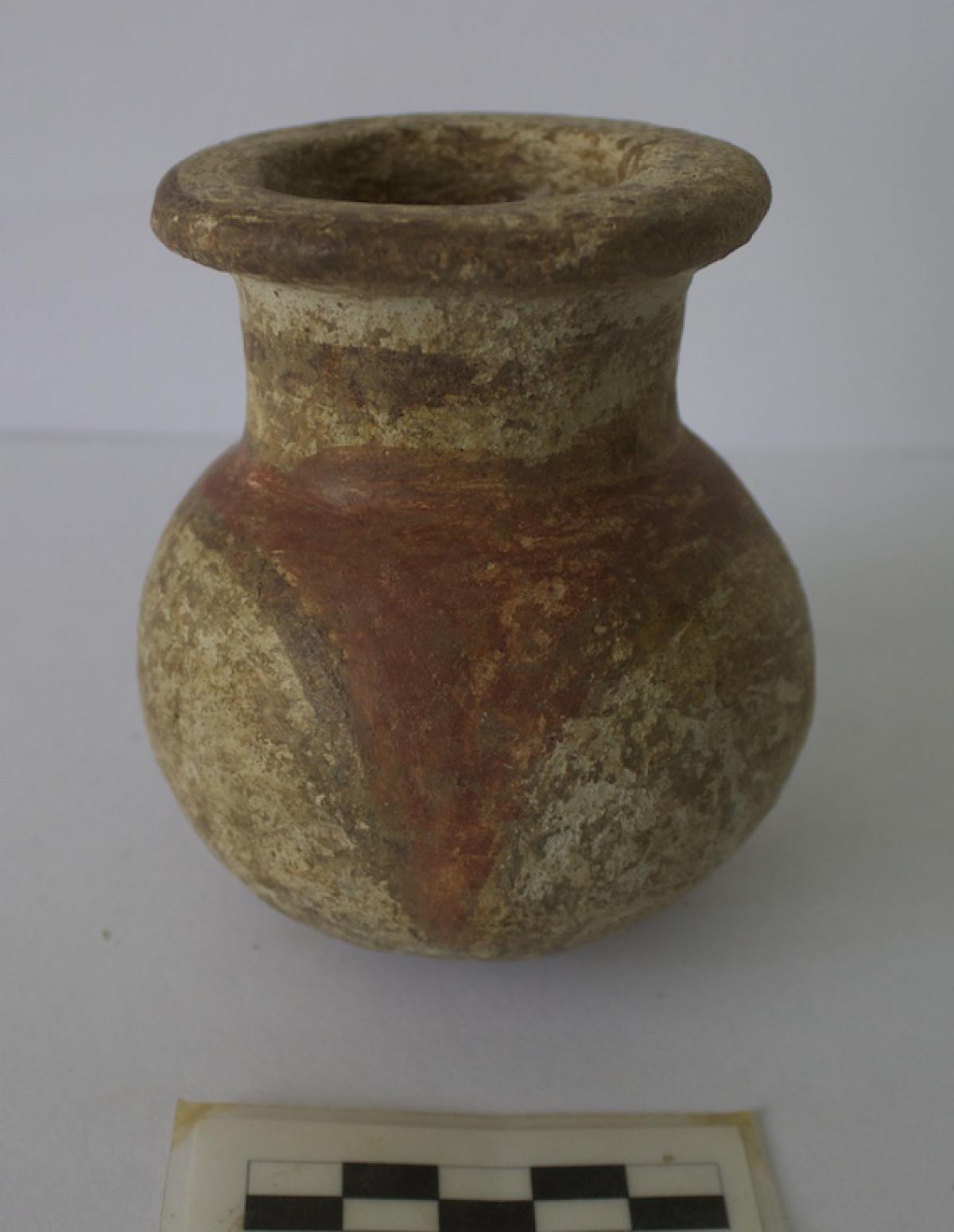3565 - Jarra globular con base anular, cuello largo y borde recto. Engobe de color rojo en el exterior y engobe de color blanco sobre el cuello. Banda de color morado sobre el cuello.
